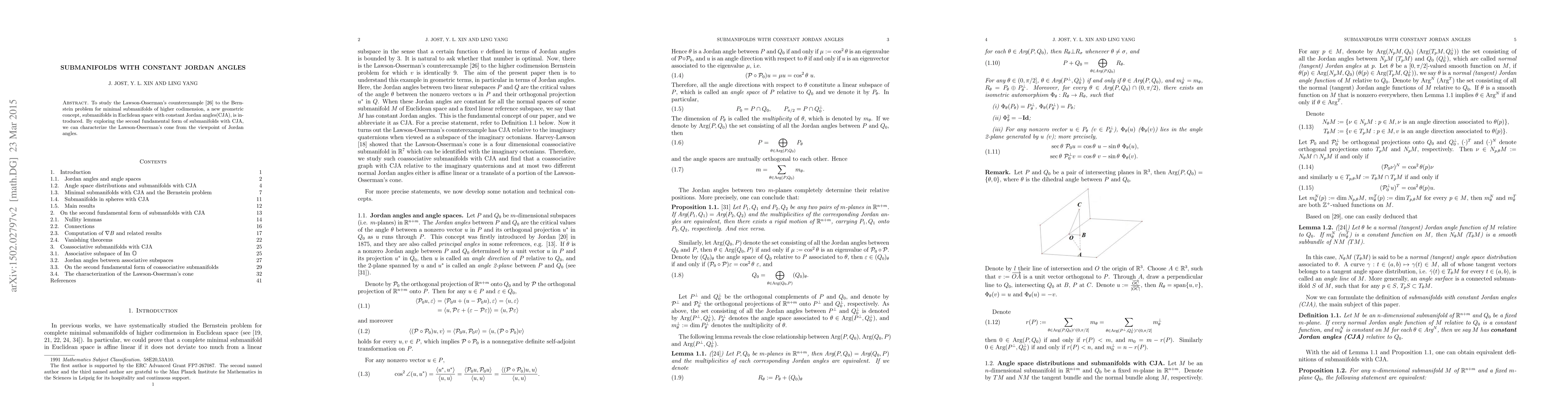 To study the Lawson-Osserman's counterexample to the Bernstein problem for minimal submanifolds of higher codimension, a new geometric concept, submanifolds in Euclidean space with constant Jordan angles(CJA), is introduced. By exploring the second fundamental form of submanifolds with CJA, we can characterize the Lawson-Osserman's cone from the viewpoint of Jordan angles.