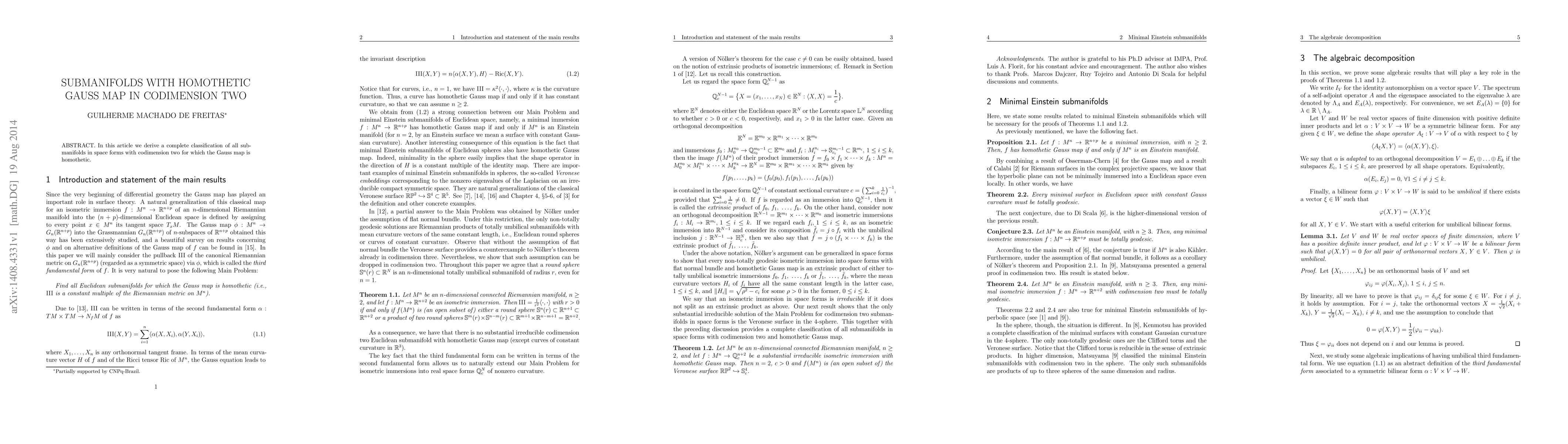 Summary: This paper provides a comprehensive classification of submanifolds in space forms with codimension two where the Gauss map exhibits homothetic properties. The study reveals the intrinsic geometric characteristics and conditions under which such submanifolds occur.
