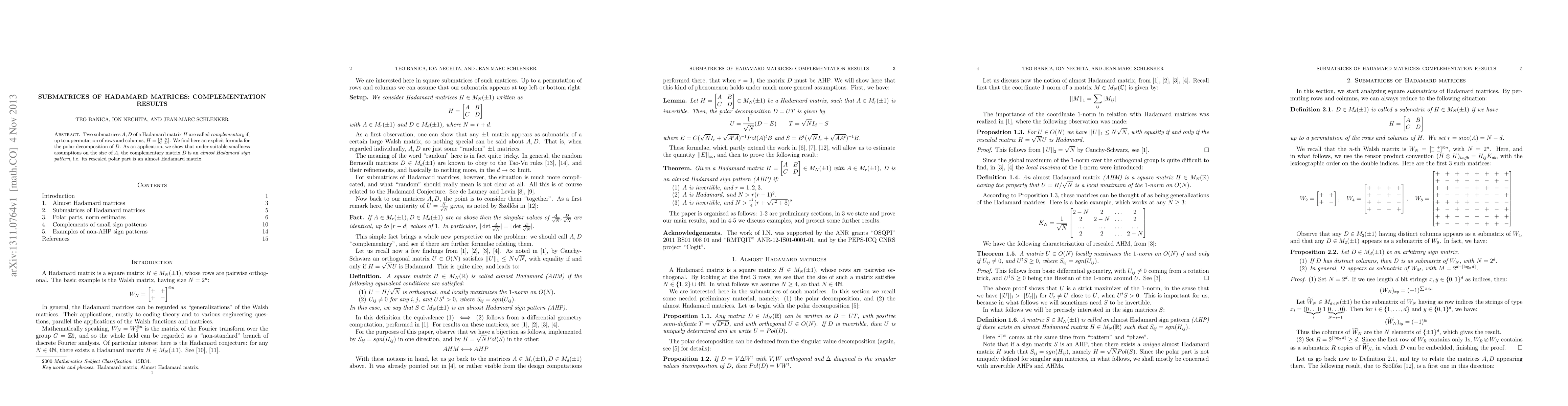 Two submatrices $A,D$ of a Hadamard matrix $H$ are called complementary if, up to a permutation of rows and columns, $H=[^A_C{\ }^B_D]$. We find here an explicit formula for the polar decomposition of $D$. As an application, we show that under suitable smallness assumptions on the size of $A$, the complementary matrix $D$ is an almost Hadamard sign pattern, i.e. its rescaled polar part is an almost Hadamard matrix.