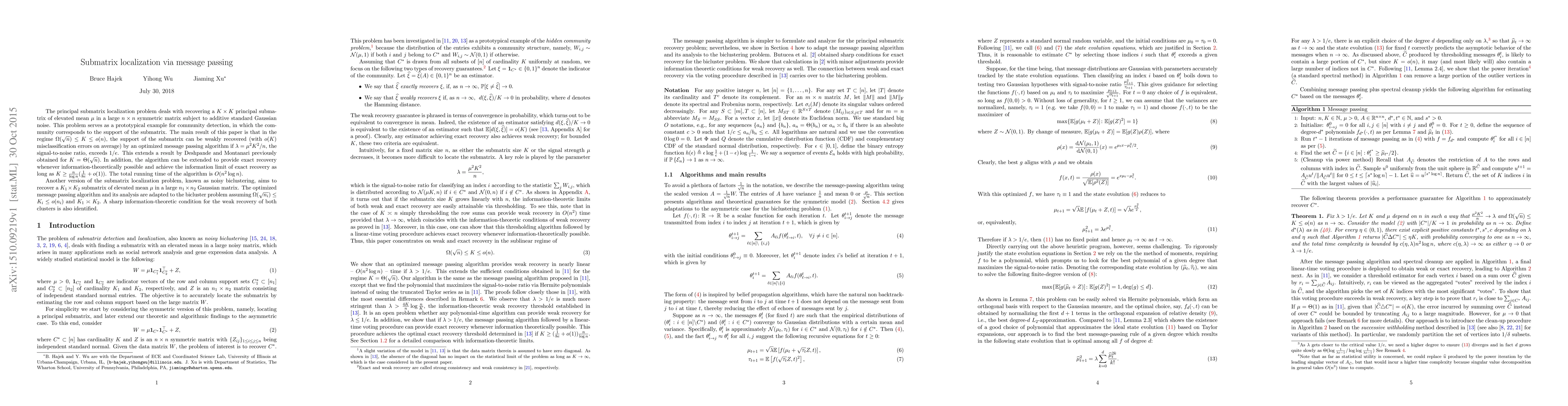 This paper presents an optimized message passing algorithm for submatrix localization in large symmetric matrices, achieving weak recovery with few errors when the signal-to-noise ratio exceeds $1/e$. The algorithm extends to biclustering problems and identifies sharp information-theoretic conditions for recovery.