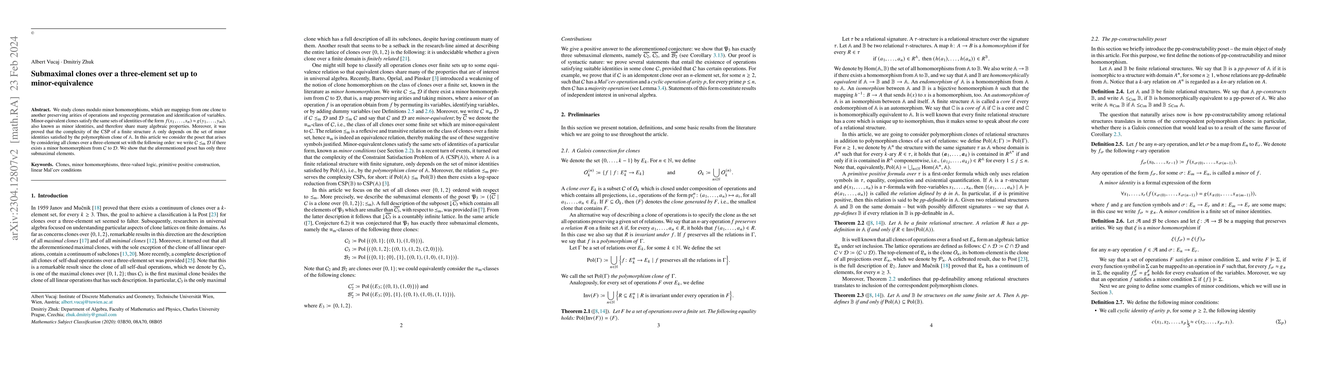This paper investigates clones over a three-element set under minor homomorphisms, revealing that the poset of these clones has only three submaximal elements. The study highlights the significance of minor identities in determining the complexity of constraint satisfaction problems.