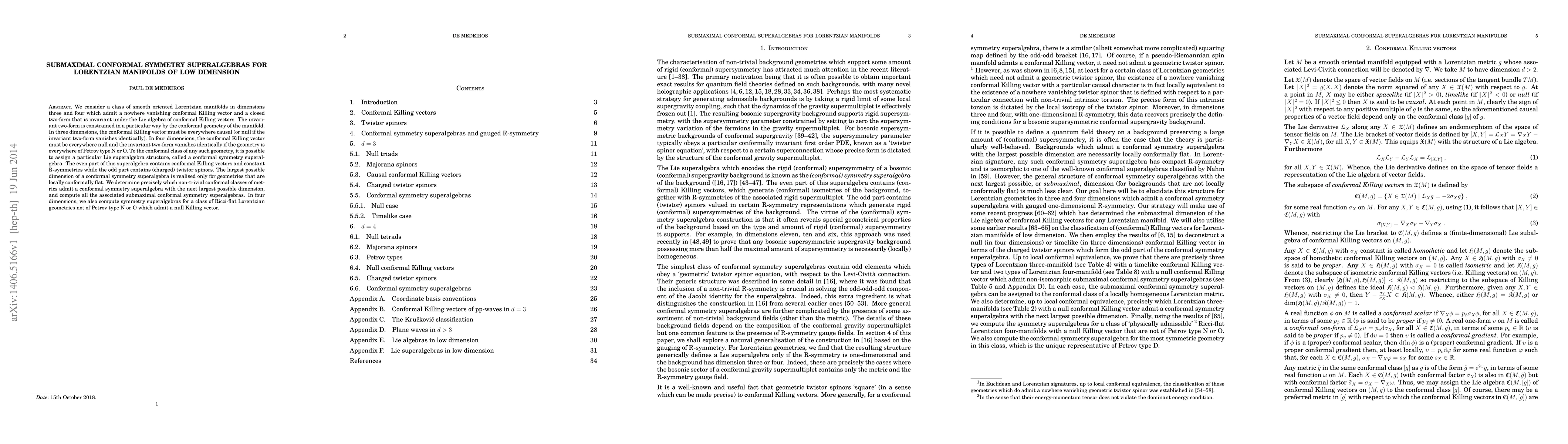 This paper investigates conformal symmetry superalgebras for low-dimensional Lorentzian manifolds with specific geometric properties, determining the largest possible dimensions and identifying submaximal conformal symmetry superalgebras for three and four-dimensional cases. It focuses on manifolds with invariant two-forms and null conformal Killing vectors, particularly in scenarios where Ricci-flat geometries exist.