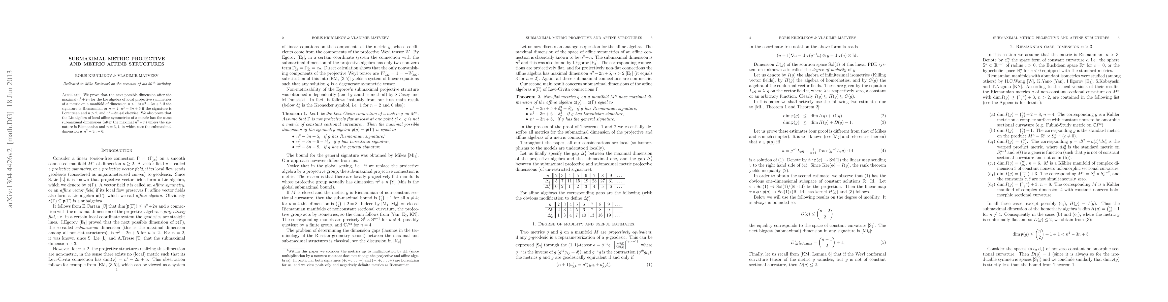 We prove that the next possible dimension after the maximal $n^2+2n$ for the Lie algebra of local projective symmetries of a metric on a manifold of dimension $n>1$ is $n^2-3n+5$ if the signature is Riemannian or $n=2$, $n^2-3n+6$ if the signature is Lorentzian and $n>2$, and $n^2-3n+8$ elsewise. We also prove that the Lie algebra of local affine symmetries of a metric has the same submaximal dimensions (after the maximal $n^2+n$) unless the signature is Riemannian and $n=3,4$, in which case the submaximal dimension is $n^2-3n+6$.