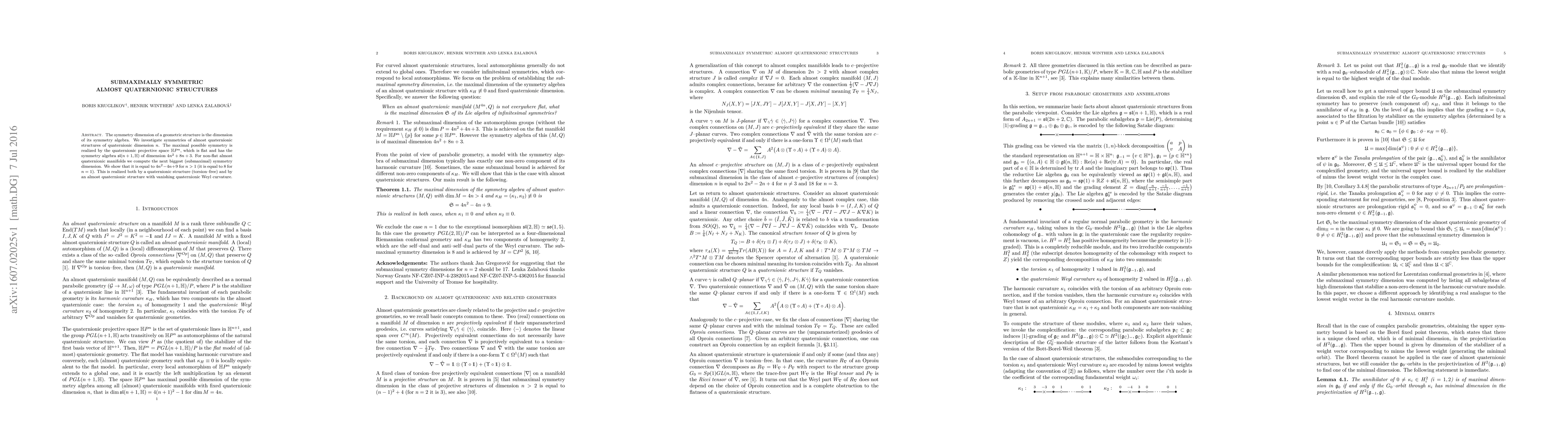 The symmetry dimension of a geometric structure is the dimension of its symmetry algebra. We investigate symmetries of almost quaternionic structures of quaternionic dimension $n$. The maximal possible symmetry is realized by the quaternionic projective space $\mathbb{H}P^n$, which is flat and has the symmetry algebra $\mathfrak{sl}(n+1,\mathbb{H})$ of dimension $4n^2+8n+3$. For non-flat almost quaternionic manifolds we compute the next biggest (submaximal) symmetry dimension. We show that it is equal to $4n^2-4n+9$ for $n>1$ (it is equal to 8 for $n=1$). This is realized both by a quaternionic structure (torsion--free) and by an almost quaternionic structure with vanishing quaternionic Weyl curvature.