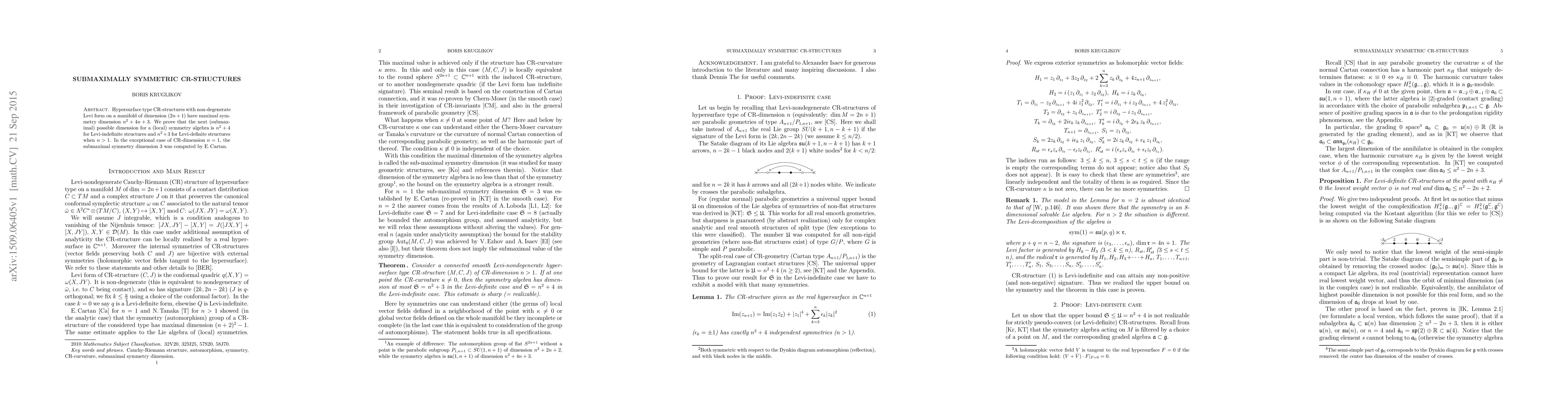 Hypersurface type CR-structures with non-degenerate Levi form on a manifold of dimension $(2n+1)$ have maximal symmetry dimension $n^2+4n+3$. We prove that the next (submaximal) possible dimension for a (local) symmetry algebra is $n^2+4$ for Levi-indefinite structures and $n^2+3$ for Levi-definite structures when $n>1$. In the exceptional case of CR-dimension $n=1$, the submaximal symmetry dimension 3 was computed by E.\,Cartan.