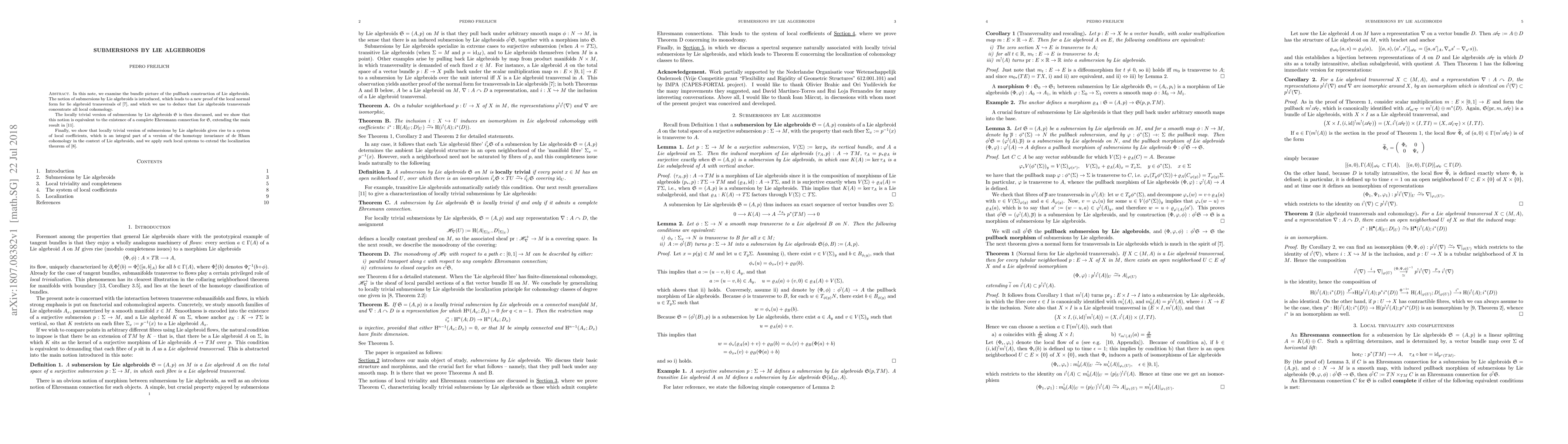 This paper introduces submersions by Lie algebroids and uses this notion to prove the local normal form for Lie algebroid transversals and show that such transversals capture all local cohomology. It also establishes the equivalence between the locally trivial version of these submersions and the existence of a complete Ehresmann connection, and demonstrates how they lead to systems of local coefficients that contribute to the homotopy invariance of de Rham cohomology.