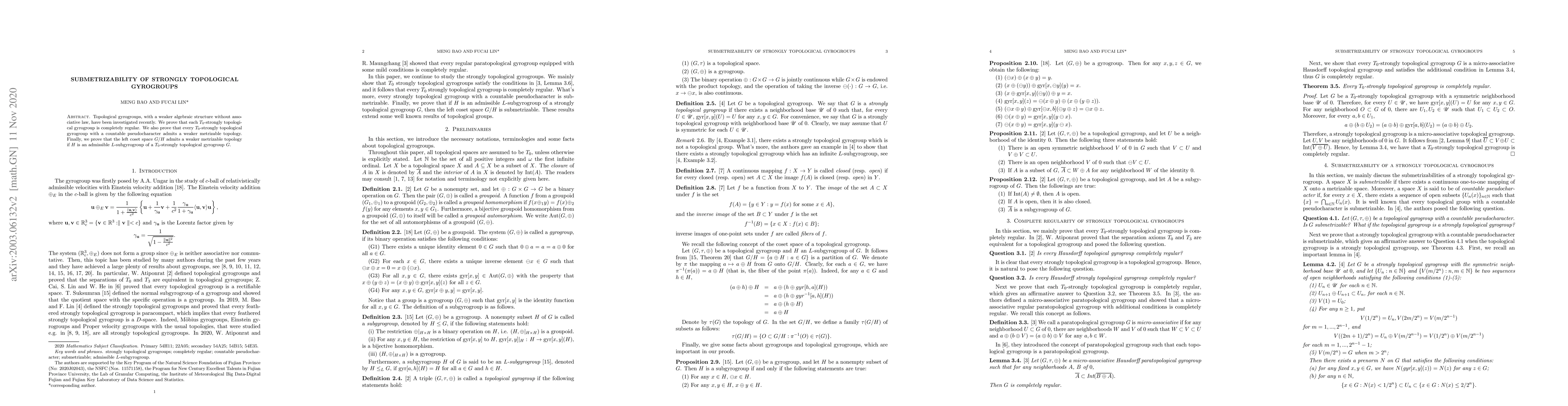 Topological gyrogroups, with a weaker algebraic structure without associative law, have been investigated recently. We prove that each $T_{0}$-strongly topological gyrogroup is completely regular. We also prove that every $T_{0}$-strongly topological gyrogroup with a countable pseudocharacter is submetrizable. Finally, we prove that the left coset space $G/H$ is submetrizable if $H$ is an admissible $L$-subgyrogroup of a $T_{0}$-strongly topological gyrogroup $G$.