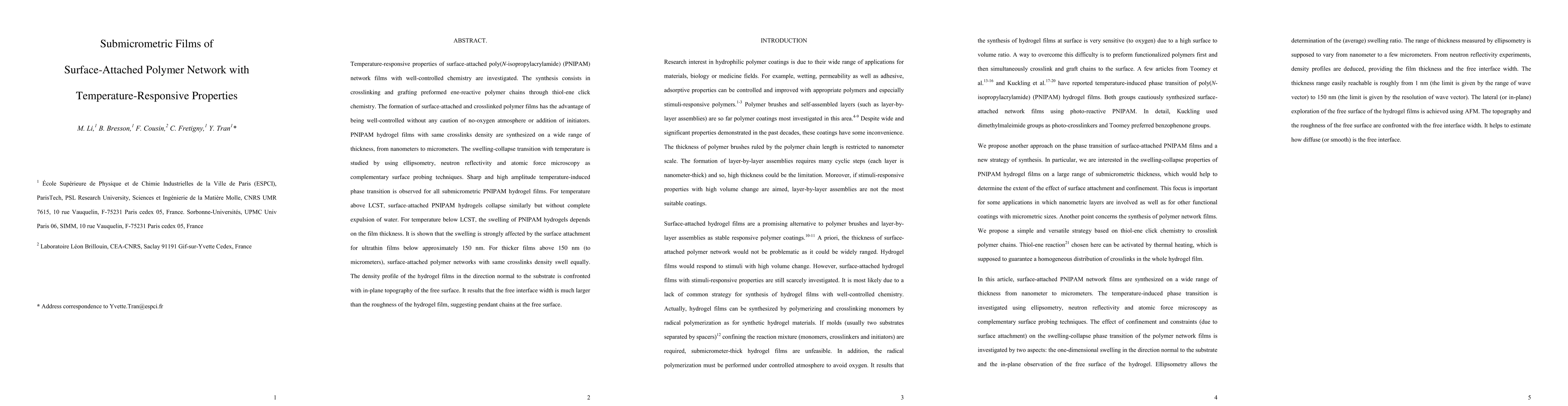 This paper investigates temperature-responsive poly(N-isopropylacrylamide) (PNIPAM) network films synthesized via thiol-ene click chemistry, showing sharp phase transitions and varying swelling behavior based on film thickness. Ultrathin films exhibit significant swelling differences due to surface attachment, while thicker films behave similarly.