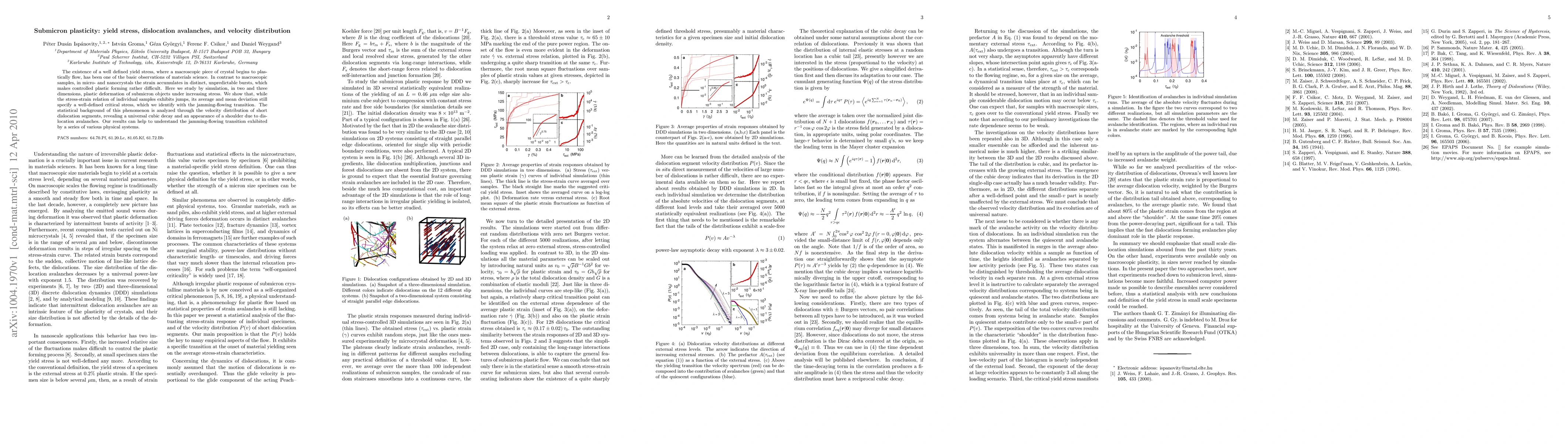 This paper investigates the plastic deformation of submicron crystals under stress, revealing a well-defined yield stress despite individual samples exhibiting unpredictable strain bursts. The study finds a universal cubic decay in dislocation segment velocity distribution and identifies a shoulder due to dislocation avalanches, providing insights into the jamming-flowing transition in various physical systems.