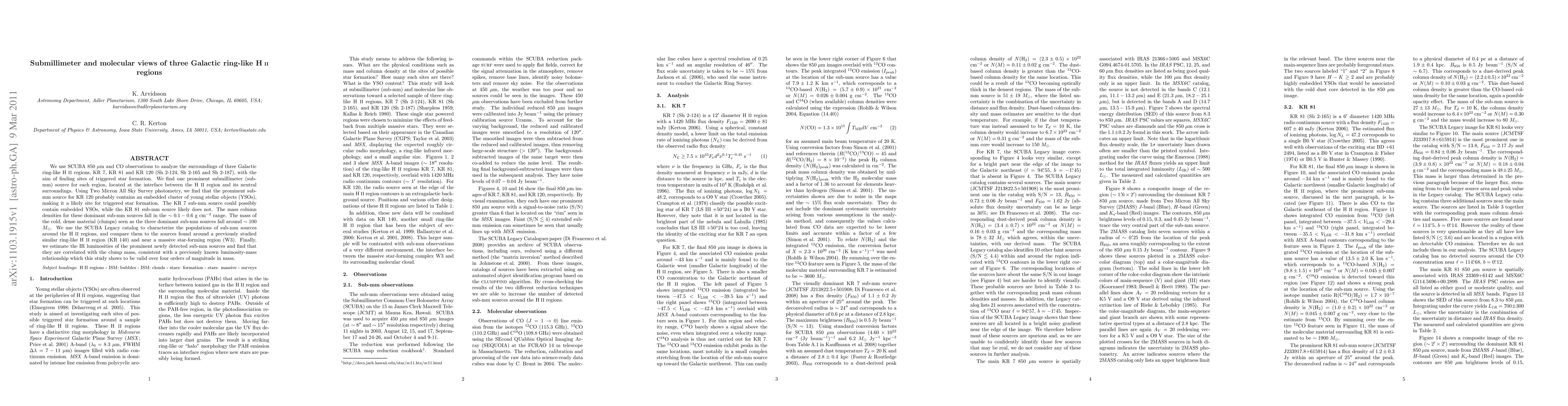 We use SCUBA 850 micron and CO observations to analyze the surroundings of three Galactic ring-like HII regions, KR 7, KR 81, and KR 120 (Sh 2-124, Sh 2-165 and Sh 2-187), with the aim of finding sites of triggered star formation. We find one prominent submillimeter (sub-mm) source for each region, located at the interface between the HII region and its neutral surroundings. Using Two Micron All Sky Survey photometry, we find that the prominent sub-mm source for KR 120 probably contains an embedded cluster of young stellar objects (YSOs), making it a likely site for triggered star formation. The KR 7 sub-mm source could possibly contain embedded YSOs, while the KR 81 sub-mm source likely does not. The mass column densities for these dominant sub-mm sources fall in the ~0.1-0.6 g cm^{-2} range. The mass of the cold, dense material (clumps) seen as the three dominant sub-mm sources fall around ~100 Solar masses. We use the SCUBA Legacy catalog to characterize the populations of sub-mm sources around the HII regions, and compare them to the sources found around a previously studied similar ring-like HII region (KR 140) and near a massive star-forming region (W3). Finally, we estimate the IR luminosities of the prominent newly detected sub-mm sources and find that they are correlated with the clump mass, consistent with a previously known luminosity-mass relationship which this study shows to be valid over four orders of magnitude in mass.