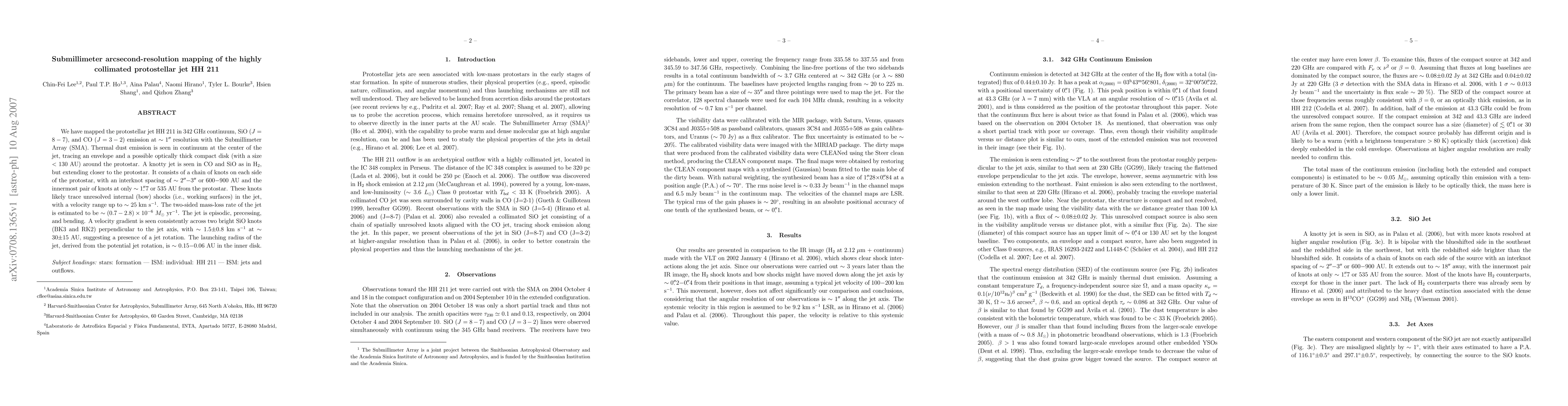 We have mapped the protostellar jet HH 211 in 342 GHz continuum, SiO ($J=8-7$), and CO ($J=3-2$) emission at $\sim$ \arcs{1} resolution with the Submillimeter Array (SMA). Thermal dust emission is seen in continuum at the center of the jet, tracing an envelope and a possible optically thick compact disk (with a size $<$ 130 AU) around the protostar. A knotty jet is seen in CO and SiO as in \H2{}, but extending closer to the protostar. It consists of a chain of knots on each side of the protostar, with an interknot spacing of $\sim$ \arcs{2}$-$\arcs{3} or 600$-$900 AU and the innermost pair of knots at only $\sim$ \arcsa{1}{7} or 535 AU from the protostar. These knots likely trace unresolved internal (bow) shocks (i.e., working surfaces) in the jet, with a velocity range up to $\sim$ 25 \vkm{}. The two-sided mass-loss rate of the jet is estimated to be $\sim (0.7-2.8)\times 10^{-6}$ \solarmass{} yr$^{-1}$. The jet is episodic, precessing, and bending. A velocity gradient is seen consistently across two bright SiO knots (BK3 and RK2) perpendicular to the jet axis, with $\sim$ 1.5$\pm$0.8 \vkm{} at $\sim$ 30$\pm$15 AU, suggesting a presence of a jet rotation. The launching radius of the jet, derived from the potential jet rotation, is $\sim$ 0.15$-$0.06 AU in the inner disk.