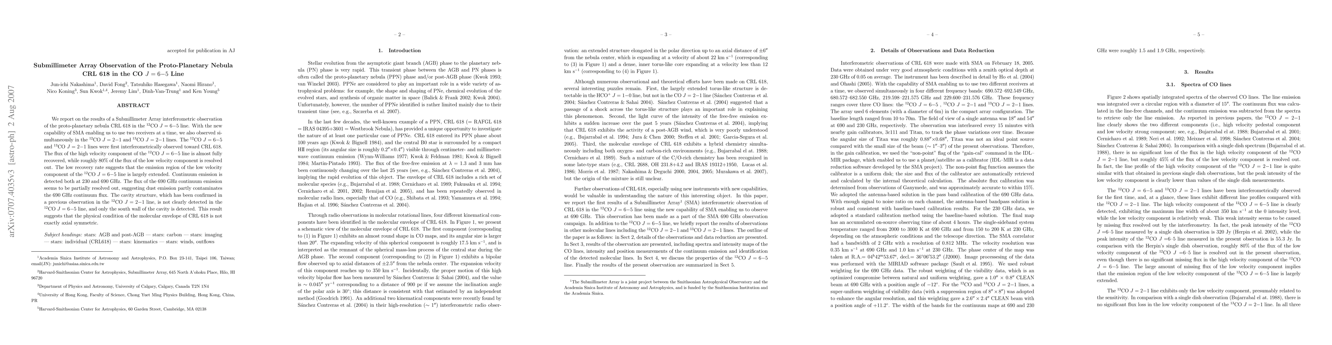 We report on the results of a Submillimeter Array interferometric observation of the proto-planetary nebula CRL 618 in the 12CO J=6-5 line. With the new capability of SMA enabling us to use two receivers at a time, we also observed simultaneously in the 12CO J=2-1 and 13CO J=2-1 lines. The 12CO J=6-5 and 13CO J=2-1 lines were first interferometrically observed toward CRL 618. The flux of the high velocity component of the 12CO J=6-5 line is almost fully recovered, while roughly 80% of the flux of the low velocity component is resolved out. The low recovery rate suggests that the emission region of the low velocity component of the 12CO J=6-5 line is largely extended. Continuum emission is detected both at 230 and 690 GHz. The flux of the 690 GHz continuum emission seems to be partially resolved out, suggesting dust emission partly contaminates the 690 GHz continuum flux. The cavity structure, which has been confirmed in a previous observation in the 12CO J=2-1 line, is not clearly detected in the 12CO J=6-5 line, and only the south wall of the cavity is detected. This result suggests that the physical condition of the molecular envelope of CRL 618 is not exactly axial symmetric.