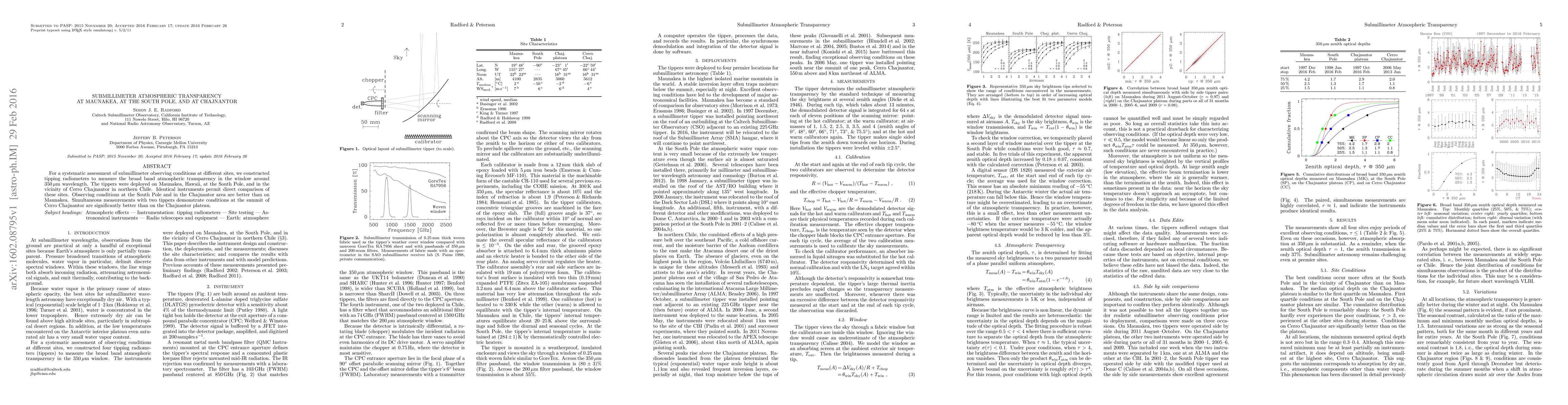 For a systematic assessment of submillimeter observing conditions at different sites, we constructed tipping radiometers to measure the broad band atmospheric transparency in the window around 350 $\mu$m wavelength. The tippers were deployed on Maunakea, Hawaii, at the South Pole, and in the vicinity of Cerro Chajnantor in northern Chile. Identical instruments permit direct comparison of these sites. Observing conditions at the South Pole and in the Chajnantor area are better than on Maunakea. Simultaneous measurements with two tippers demonstrate conditions at the summit of Cerro Chajnantor are significantly better than on the Chajnantor plateau.