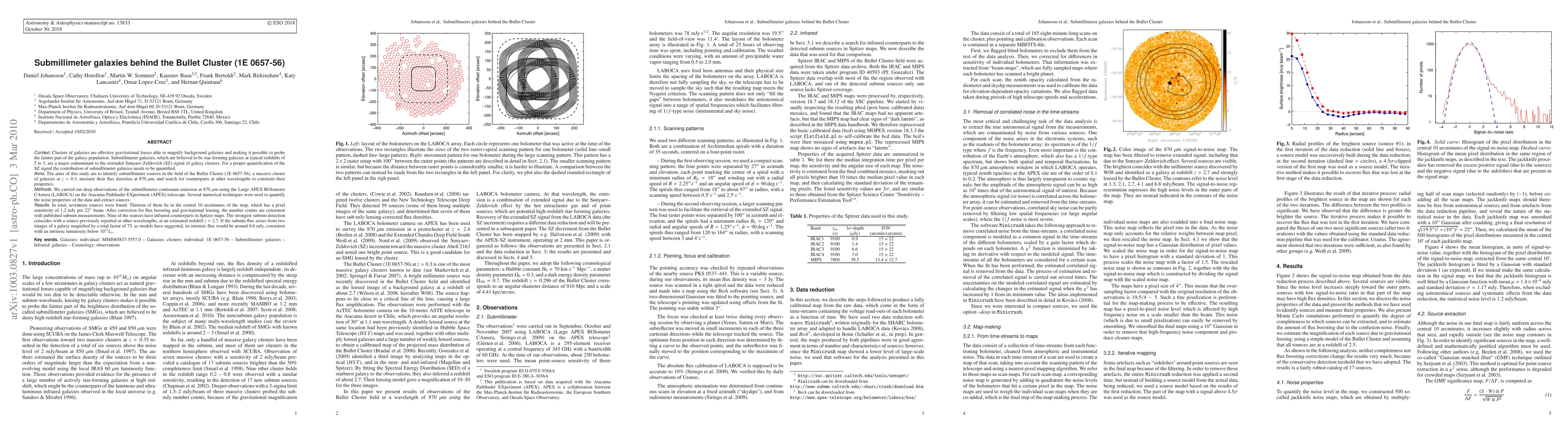 This study identifies submillimeter galaxies behind the Bullet Cluster using LABOCA on the APEX telescope, finding seventeen sources, with nine having infrared counterparts. The results help quantify the contamination of submillimeter galaxies to the Sunyaev-Zeldovich signal, revealing intrinsic properties consistent with low luminosity star-forming galaxies.