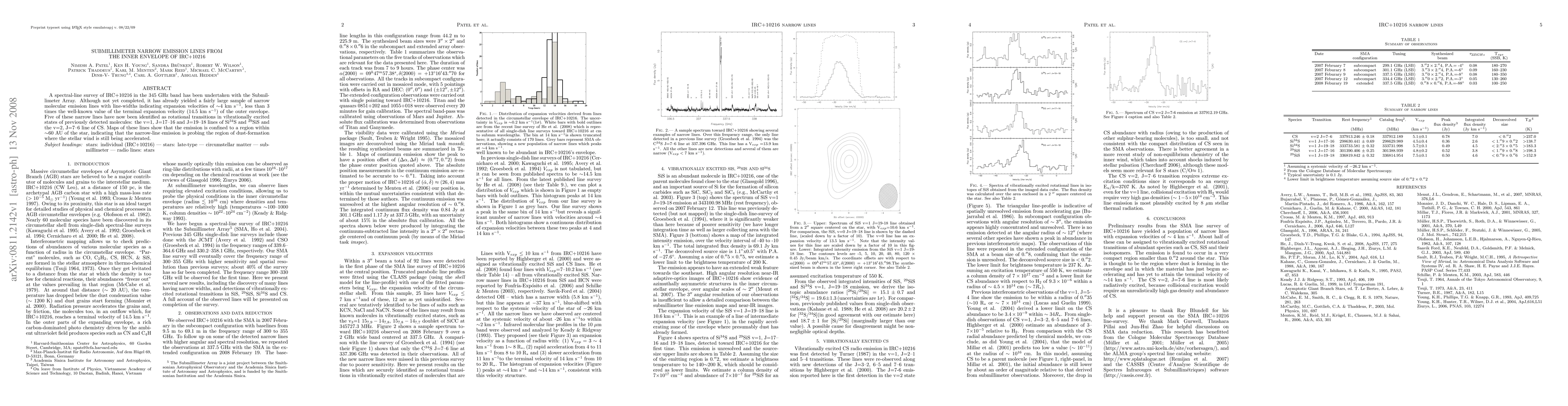 A spectral-line survey of IRC+10216 in the 345 GHz band has been undertaken with the Submillimeter Array. Although not yet completed, it has already yielded a fairly large sample of narrow molecular emission lines with line-widths indicating expansion velocities of ~4 km/s, less than 3 times the well-known value of the terminal expansion velocity (14.5 km/s) of the outer envelope. Five of these narrow lines have now been identified as rotational transitions in vibrationally excited states of previously detected molecules: the v=1, J=17--16 and J=19--18 lines of Si34S and 29SiS and the v=2, J=7--6 line of CS. Maps of these lines show that the emission is confined to a region within ~60 AU of the star, indicating that the narrow-line emission is probing the region of dust-formation where the stellar wind is still being accelerated.