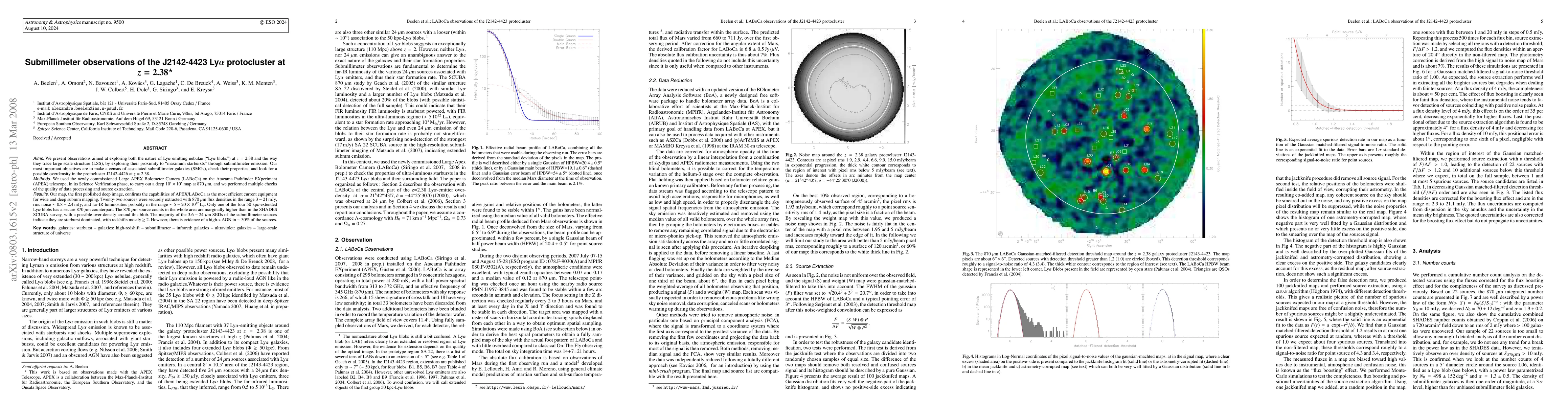 We present observations aimed at exploring both the nature of Lya emitting nebulae (Lya blobs) at z=2.38 and the way they trace large scale structure (LSS), by exploring their proximity to maximum starbursts through submillimeter emission. Our most important objectives are to make a census of associated submillimeter galaxies (SMGs), check their properties, and look for a possible overdensity in the protocluster J2142-4426 at z=2.38. We used the newly commissioned Large APEX Bolometer Camera (LABoCa) on the Atacama Pathfinder EXperiment (APEX) telescope, in its Science Verification phase, to carry out a deep 10'x10' map at 870 micron, and we performed multiple checks of the quality of data processing and source extraction. Our map, the first published deep image, confirms the capabilities of APEX/LABoCa as the most efficient current equipment for wide and deep submm mapping. Twenty-two sources were securely extracted with 870 micron flux densities in the range 3-21 mJy, rms noise 0.8-2.4 mJy, and far-IR luminosities probably in the range ~5-20 x 10(12) Lo. Only one of the four 50 kpc-extended Lya blobs has a secure 870 micron counterpart. The 870 micron source counts in the whole area are marginally higher than in the SHADES SCUBA survey, with a possible over-density around this blob. The majority of the 3.6-24 micron SEDs of the submillimeter sources indicate they are starburst dominated, with redshifts mostly >2. However, there is evidence of a high-z AGN in ~30% of the sources.