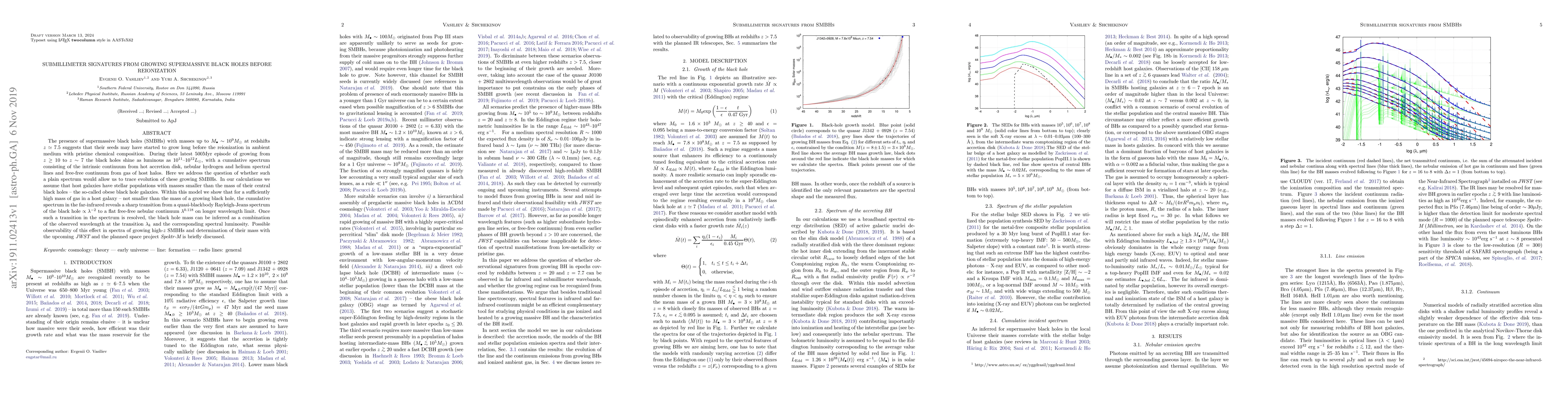 The presence of supermassive black holes (SMBHs) with masses up to $M_\bullet\sim10^9M_\odot$ at redshifts $z\simeq7.5$ suggests that their seeds may have started to grow long before the reionization in ambient medium with pristine chemical composition. During their latest 500Myr episode of growing from $z\geq10$ to $z\sim7$ the black holes shine as luminous as $10^{11}\hbox{--}10^{12}L_\odot$, with a cumulative spectrum consisting of the intrinsic continuum from hot accretion disk, nebular hydrogen and helium spectral lines and free-free continuum from gas of host halos. Here we address the question of whether such a plain spectrum would allow us to trace evolution of these growing SMBHs. In our calculations we assume that host galaxies have stellar populations with masses smaller than the mass of their central black holes -- the so-called obese black hole galaxies. Within this model we show that for a sufficiently high mass of gas in a host galaxy -- not smaller than the mass of a growing black hole, the cumulative spectrum in the far-infrared reveals a sharp transition from a quasi-blackbody Rayleigh-Jeans spectrum of the black hole $\propto\lambda^{-2}$ to a flat free-free nebular continuum $\lambda^{0.118}$ on longer wavelength limit. Once such a transition in the spectrum is resolved, the black hole mass can be inferred as a combination of the observed wavelength at the transition $\lambda_k$ and the corresponding spectral luminosity. Possible observability of this effect in spectra of growing high-$z$ SMBHs and determination of their mass with the upcoming JWST and the planned space project Spektr-M is briefly discussed.