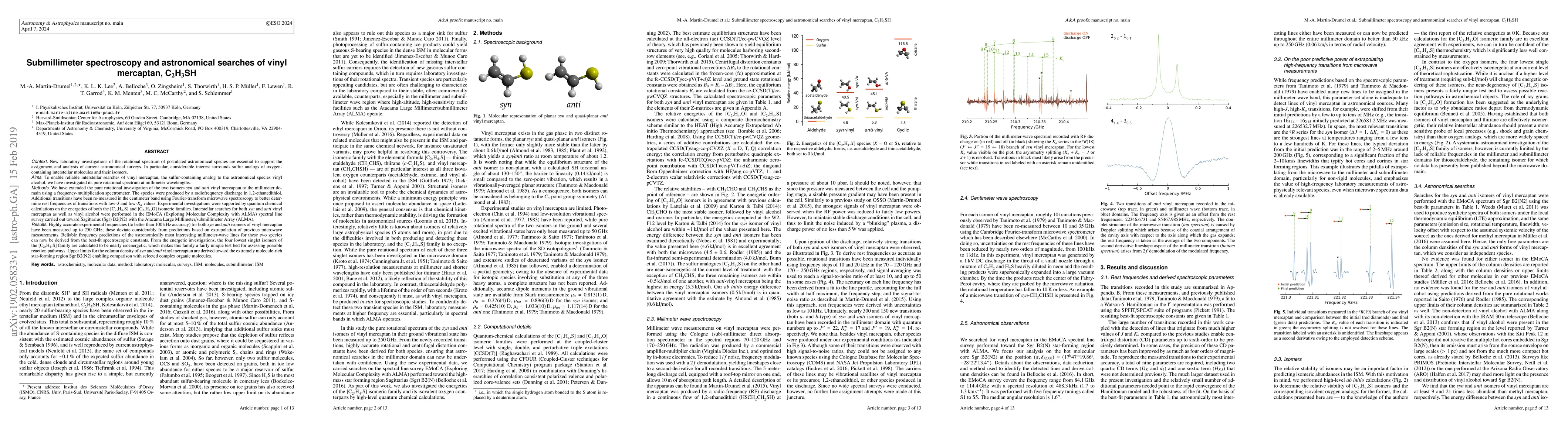 We have extended the pure rotational investigation of the two isomers syn and anti vinyl mercaptan to the millimeter domain using a frequency-multiplication spectrometer. The species were produced by a radiofrequency discharge in 1,2-ethanedithiol. Additional transitions have been re-measured in the centimeter band using Fourier-transform microwave spectroscopy to better determine rest frequencies of transitions with low-$J$ and low-$K_a$ values. Experimental investigations were supported by quantum chemical calculations on the energetics of both the [C$_2$,H$_4$,S] and [C$_2$,H$_4$,O] isomeric families. Interstellar searches for both syn and anti vinyl mercaptan as well as vinyl alcohol were performed in the EMoCA (Exploring Molecular Complexity with ALMA) spectral line survey carried out toward Sagittarius (Sgr) B2(N2) with the Atacama Large Millimeter/submillimeter Array (ALMA). Highly accurate experimental frequencies (to better than 100 kHz accuracy) for both syn and anti isomers of vinyl mercaptan have been measured up to 250 GHz; these deviate considerably from predictions based on extrapolation of previous microwave measurements. Reliable frequency predictions of the astronomically most interesting millimeter-wave lines for these two species can now be derived from the best-fit spectroscopic constants. From the energetic investigations, the four lowest singlet isomers of the [C$_2$,H$_4$,S] family are calculated to be nearly isoenergetic, which makes this family a fairly unique test bed for assessing possible reaction pathways. Upper limits for the column density of syn and anti vinyl mercaptan are derived toward the extremely molecule-rich star-forming region Sgr B2(N2) enabling comparison with selected complex organic molecules.