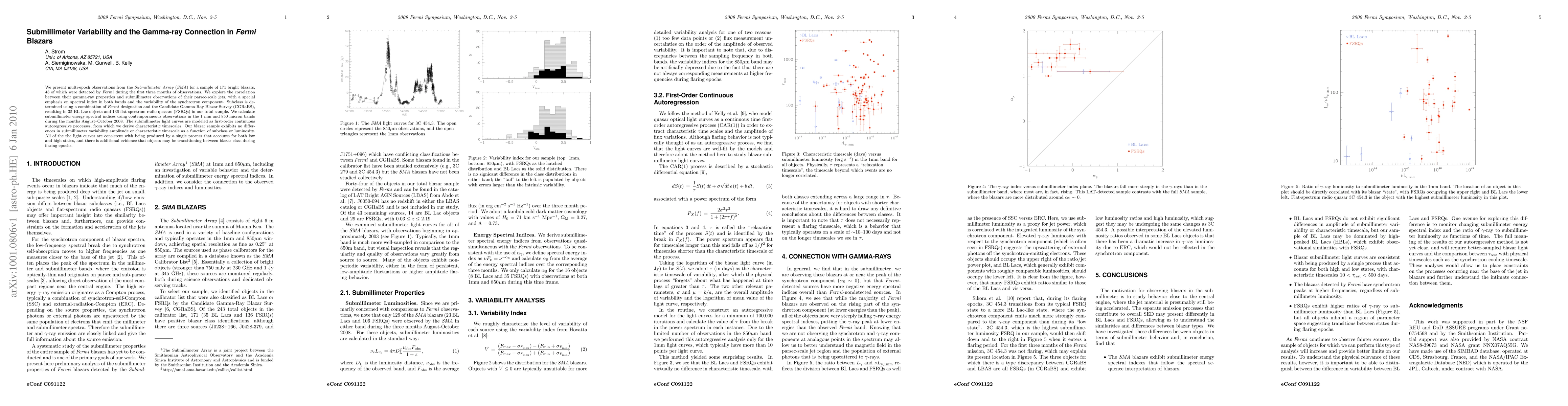 We present multi-epoch observations from the Submillimeter Array (SMA) for a sample of 171 bright blazars, 43 of which were detected by Fermi during the first three months of observations. We explore the correlation between their gamma-ray properties and submillimeter observations of their parsec-scale jets, with a special emphasis on spectral index in both bands and the variability of the synchrotron component. Subclass is determined using a combination of Fermi designation and the Candidate Gamma-Ray Blazar Survey (CGRaBS), resulting in 35 BL Lac objects and 136 flat-spectrum radio quasars (FSRQs) in our total sample. We calculate submillimeter energy spectral indices using contemporaneous observations in the 1 mm and 850 micron bands during the months August-October 2008. The submillimeter light curves are modeled as first-order continuous autoregressive processes, from which we derive characteristic timescales. Our blazar sample exhibits no differences in submillimeter variability amplitude or characteristic timescale as a function of subclass or luminosity. All of the the light curves are consistent with being produced by a single process that accounts for both low and high states, and there is additional evidence that objects may be transitioning between blazar class during flaring epochs.