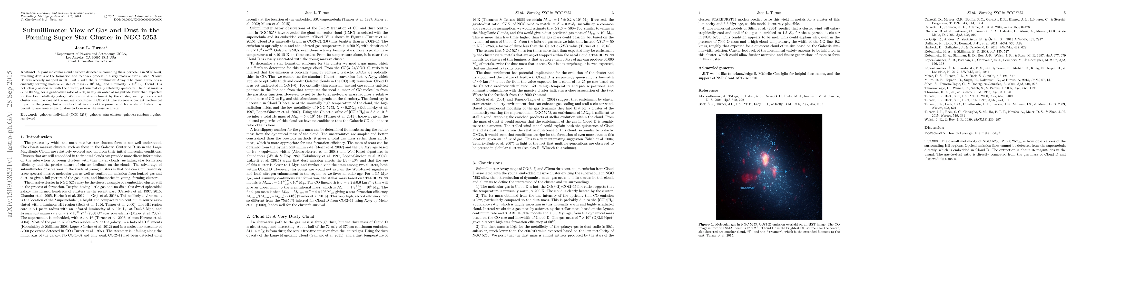 Researchers detected a giant molecular cloud, Cloud D, around the forming massive star cluster in NGC 5253 using the Submillimeter Array. The cloud is hot, associated with the cluster, yet kinematically calm. Despite the presence of thousands of O stars, there's no current mechanical impact on the cloud, possibly allowing future star formation near the massive cluster. The dust mass is unusually low, suggesting enrichment by the cluster has altered conditions in Cloud D.