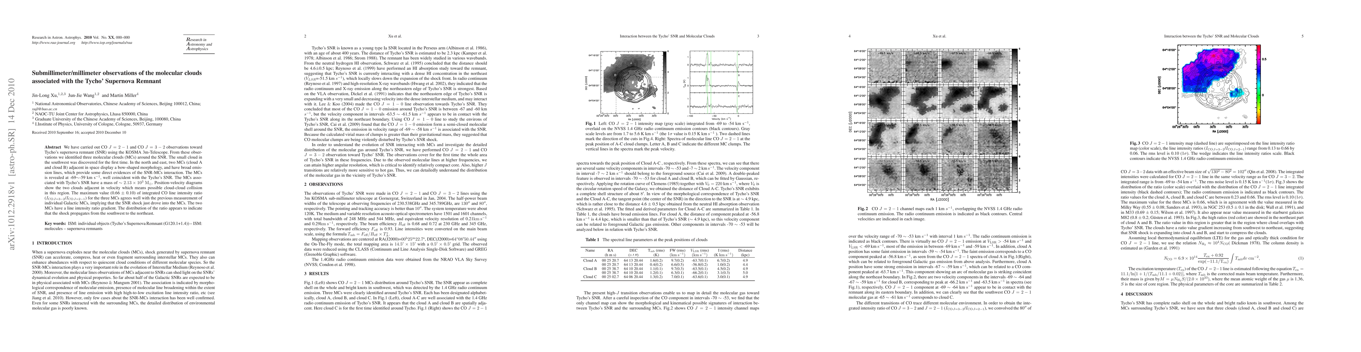 Researchers used a 3m-Telescope to observe molecular clouds near Tycho's Supernova Remnant, discovering three clouds with masses of ~2130 sun masses, and finding evidence of cloud-cloud collision and shock propagation.