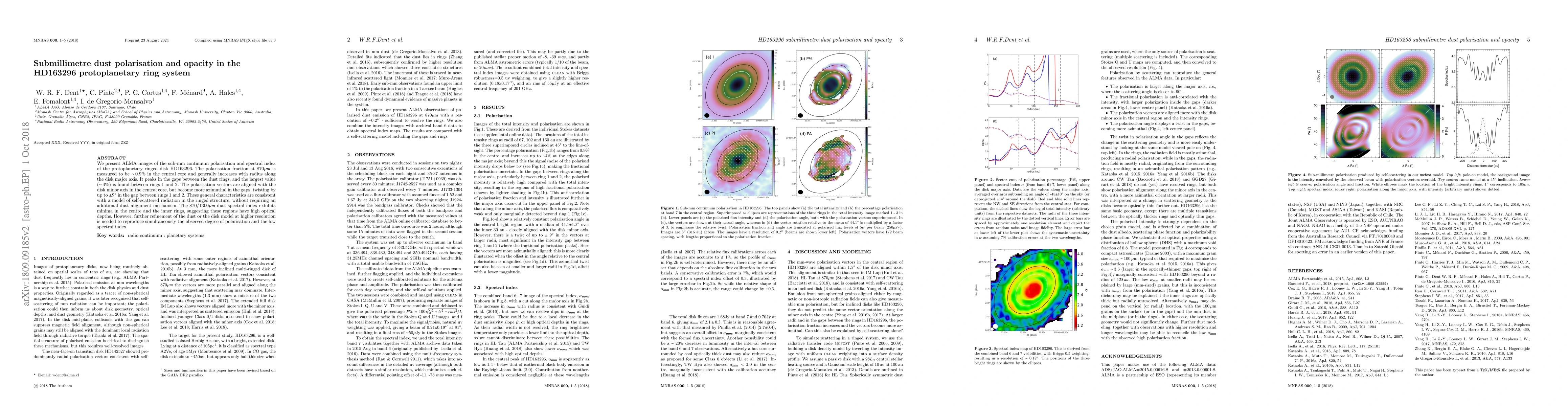This study uses ALMA to analyze submillimetre dust polarisation and opacity in the protoplanetary disk HD163296, finding that polarisation increases with radius and peaks in gaps between dust rings, consistent with self-scattered radiation. The dust spectral index indicates high optical depths in the central core and inner rings.
