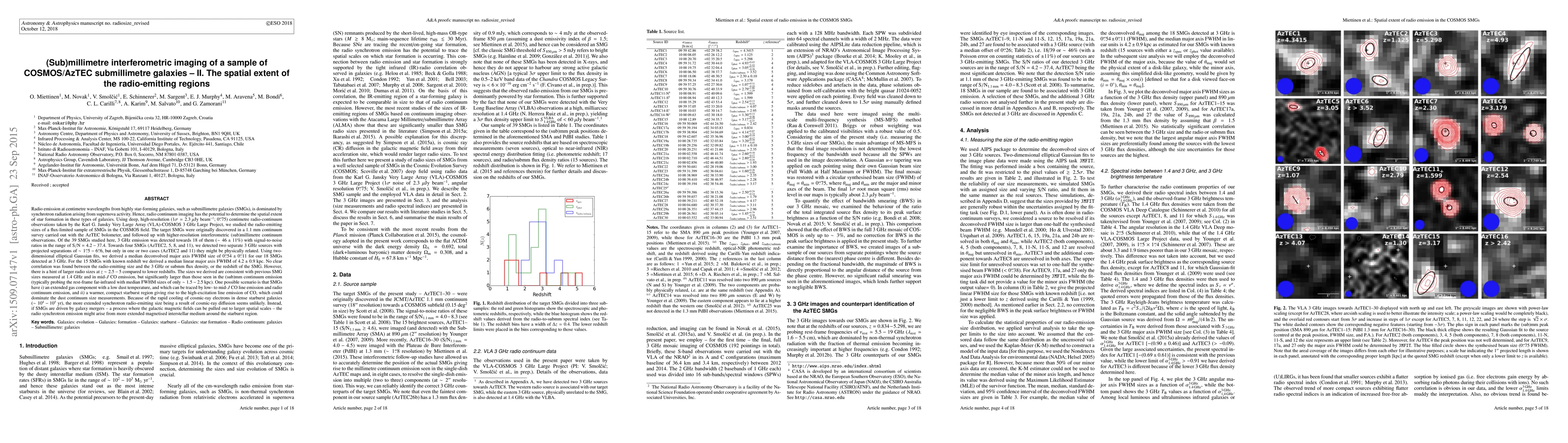 This paper investigates the radio-emitting sizes of a sample of COSMOS/AzTEC submillimetre galaxies (SMGs) using high-resolution VLA observations. The study finds that the median radio-emitting size is $4.2\pm0.9$ kpc, suggesting an extended, magnetised ISM around starburst regions, potentially driven by galaxy mergers.