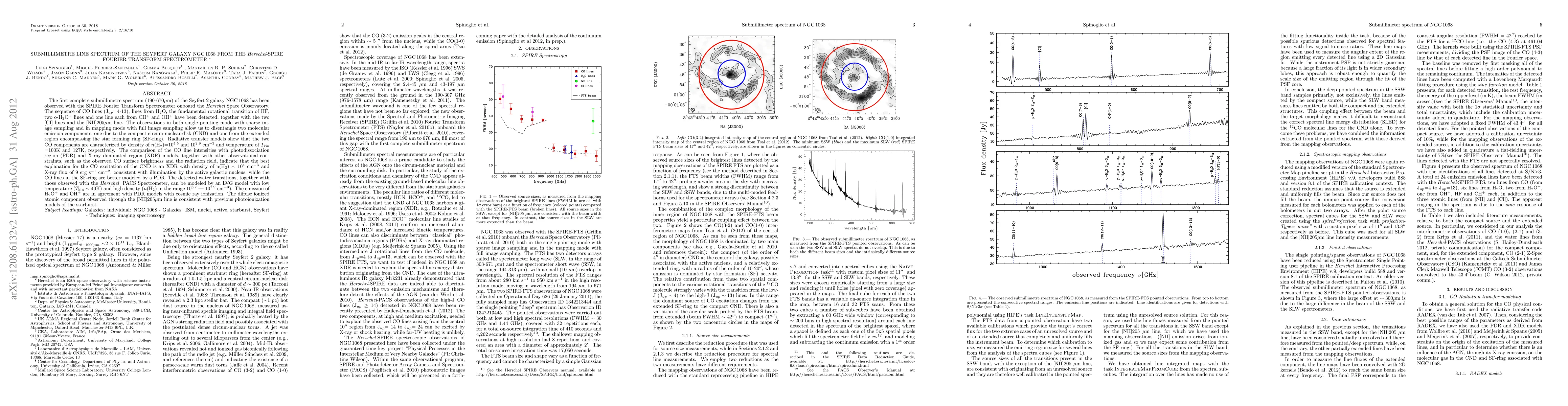 This study presents the first complete submillimetre spectrum of the Seyfert 2 galaxy NGC1068, revealing multiple molecular and atomic lines. The data indicate two distinct emission components: one from the compact circum-nuclear disk influenced by an X-ray dominated region, and another from the star-forming ring influenced by a photodissociation region.