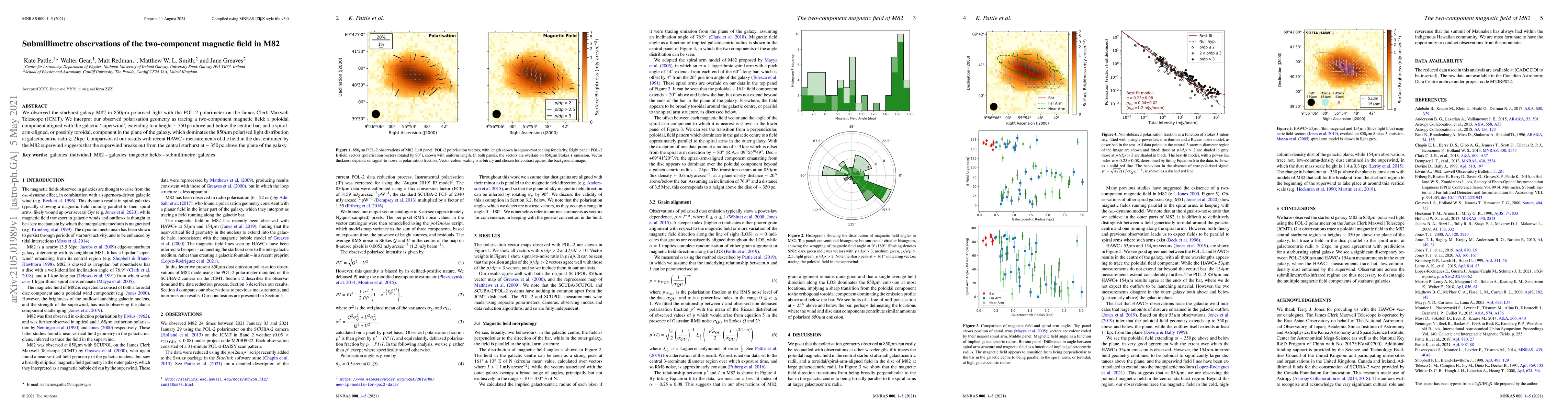 This study uses submillimetre observations of M82 to reveal a two-component magnetic field: a poloidal component aligned with the galactic superwind and a spiral-arm-aligned or toroidal component in the galaxy's plane. The findings suggest the superwind emerges from the central starburst at approximately 350 pc above the galactic plane.