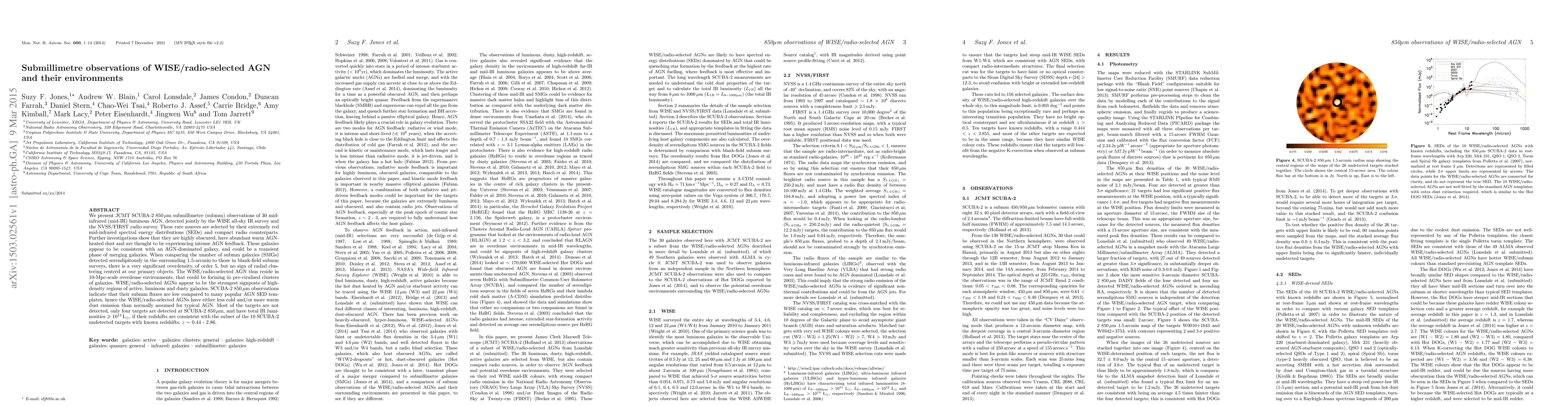 We present JCMT SCUBA-2 850microns submillimetre (submm) observations of 30 mid-infrared (mid-IR) luminous AGN, detected jointly by the WISE all-sky IR survey and the NVSS/FIRST radio survey. These rare sources are selected by their extremely red mid-infrared spectral energy distributions (SEDs) and compact radio counterparts. Further investigations show that they are highly obscured, have abundant warm AGN-heated dust and are thought to be experiencing intense AGN feedback. These galaxies appear to be consistent with an AGN-dominated galaxy, and could be a transient phase of merging galaxies. When comparing the number of submm galaxies (SMGs) detected serendipitously in the surrounding 1.5-arcmin to those in blank-field submm surveys, there is a very significant overdensity, of order 5, but no sign of radial clustering centred at our primary objects. The WISE/radio-selected AGN thus reside in 10-Mpc-scale overdense environments, that could be forming in pre-viralised clusters of galaxies. WISE/radio-selected AGNs appear to be the strongest signposts of high-density regions of active, luminous and dusty galaxies. SCUBA-2 850microns observations indicate that their submm fluxes are low compared to many popular AGN SED templates, hence the WISE/radio-selected AGNs have either less cold and/or more warm dust emission than normally assumed for typical AGN. Most of the targets are not detected, only four targets are detected at SCUBA-2 850microns, and have total IR luminosities >= 10^13 L_solar, if their redshifts are consistent with the subset of the 10 SCUBA-2 undetected targets with known redshifts, z ~ 0.44 - 2.86.