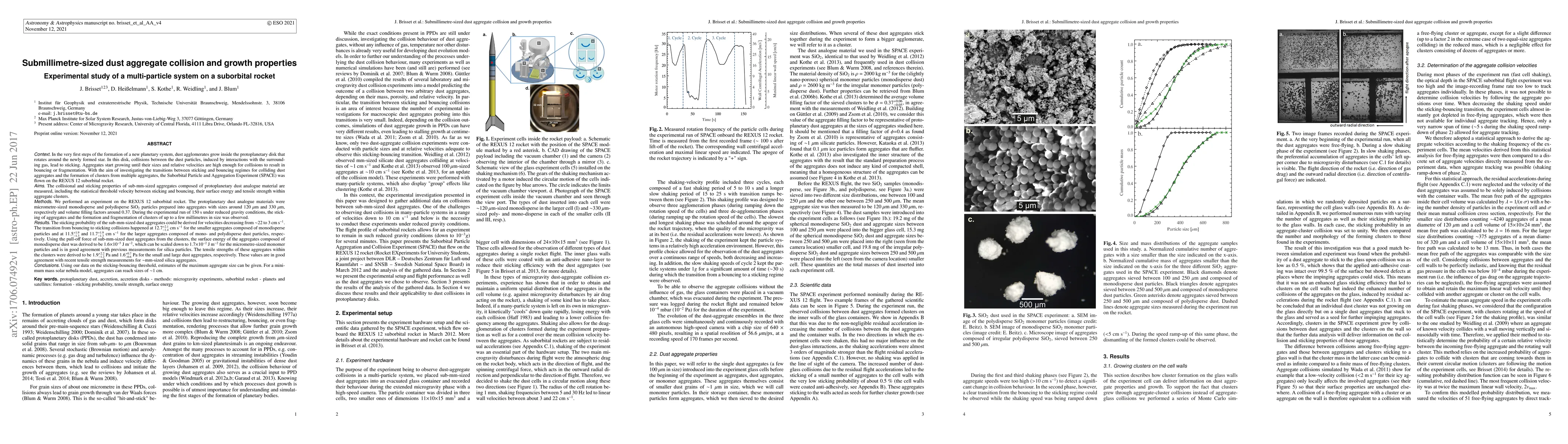 This study investigates the collision and growth properties of sub-mm-sized dust aggregates using an experiment on the REXUS 12 suborbital rocket, finding the sticking threshold velocity to be around 12.7 cm/s for smaller aggregates and 11.5-11.7 cm/s for larger ones. The surface energy and tensile strength of these aggregates were also measured.
