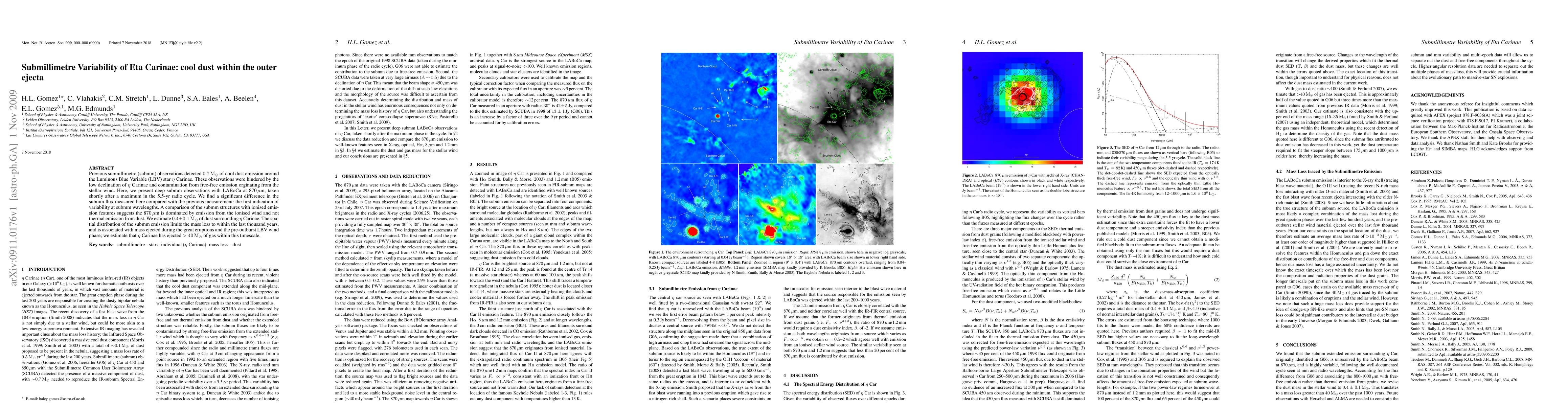 This study reveals significant variability in the submillimetre emission around Eta Carinae, detecting a decrease in cool dust mass to 0.4 +/- 0.1 solar masses. The submm flux difference indicates variability at submm wavelengths, suggesting the emission is dominated by ionised wind rather than thermal dust.