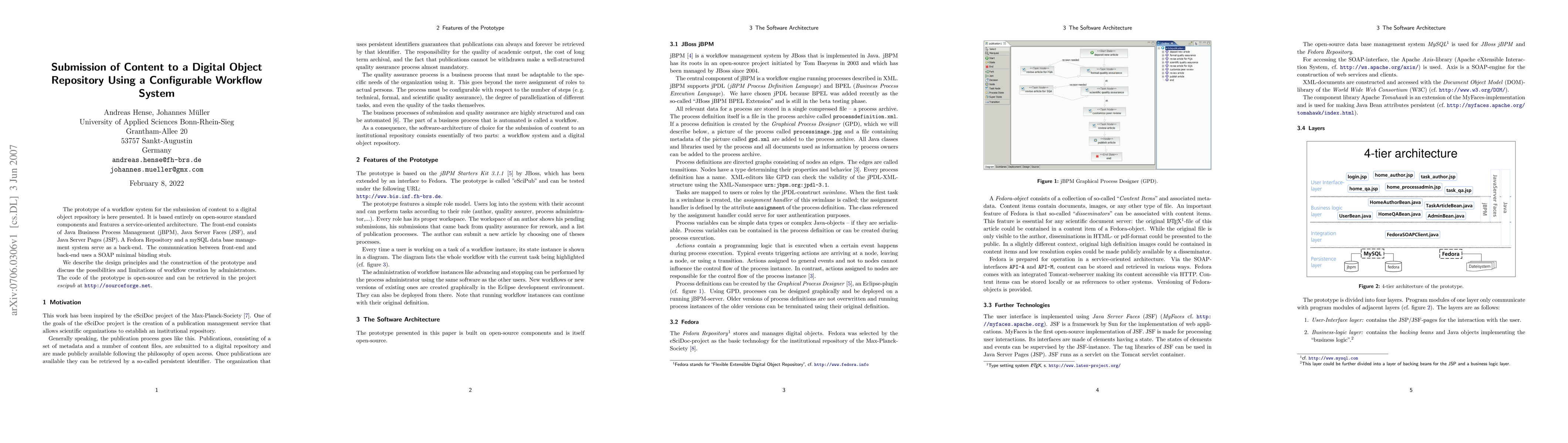 The prototype of a workflow system for the submission of content to a digital object repository is here presented. It is based entirely on open-source standard components and features a service-oriented architecture. The front-end consists of Java Business Process Management (jBPM), Java Server Faces (JSF), and Java Server Pages (JSP). A Fedora Repository and a mySQL data base management system serve as a back-end. The communication between front-end and back-end uses a SOAP minimal binding stub. We describe the design principles and the construction of the prototype and discuss the possibilities and limitations of work ow creation by administrators. The code of the prototype is open-source and can be retrieved in the project escipub at http://sourceforge.net