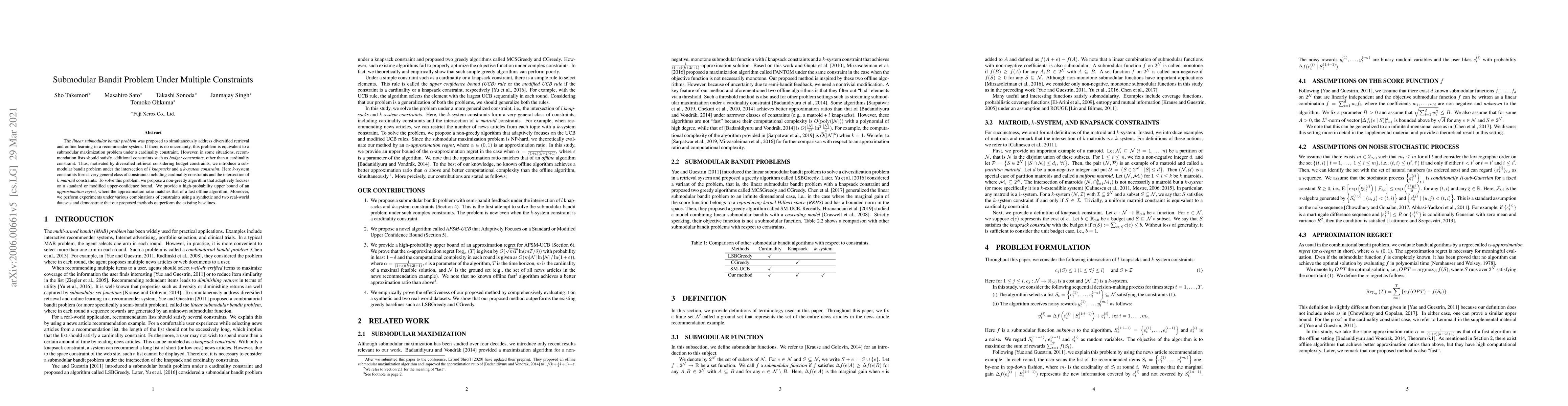 This paper introduces a submodular bandit problem that considers multiple constraints, such as budget limits, in addition to cardinality constraints. It proposes a non-greedy algorithm to tackle this problem, providing an upper bound for approximation regret. Experiments on synthetic and real-world datasets show the proposed method outperforms existing baselines.