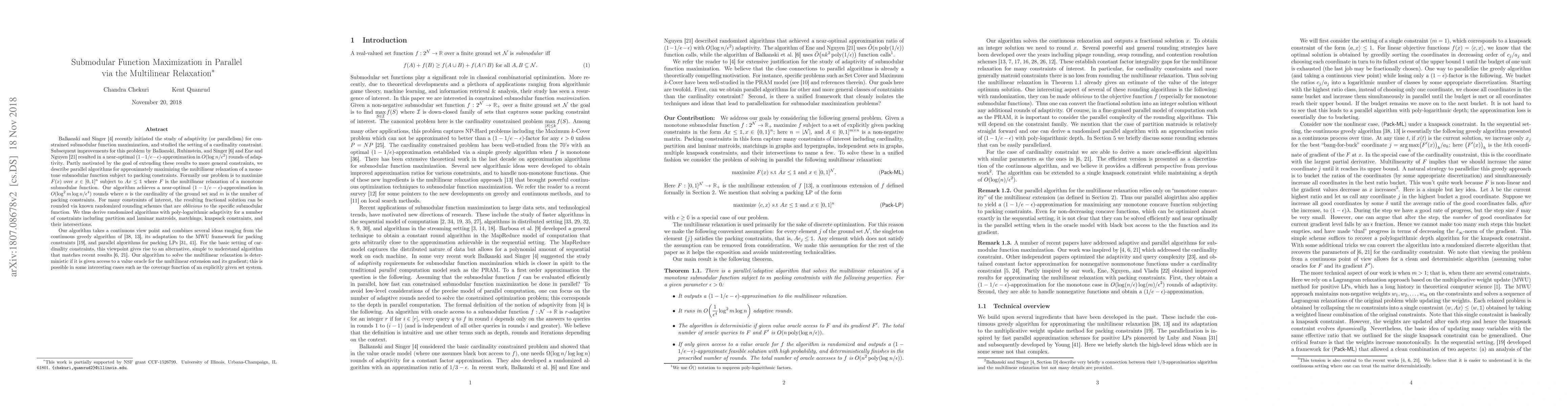 This paper presents parallel algorithms for maximizing the multilinear relaxation of monotone submodular functions under packing constraints, achieving near-optimal approximations in poly-logarithmic rounds. The algorithms extend recent improvements to more general constraints and can be rounded to yield efficient solutions for various constraint types.