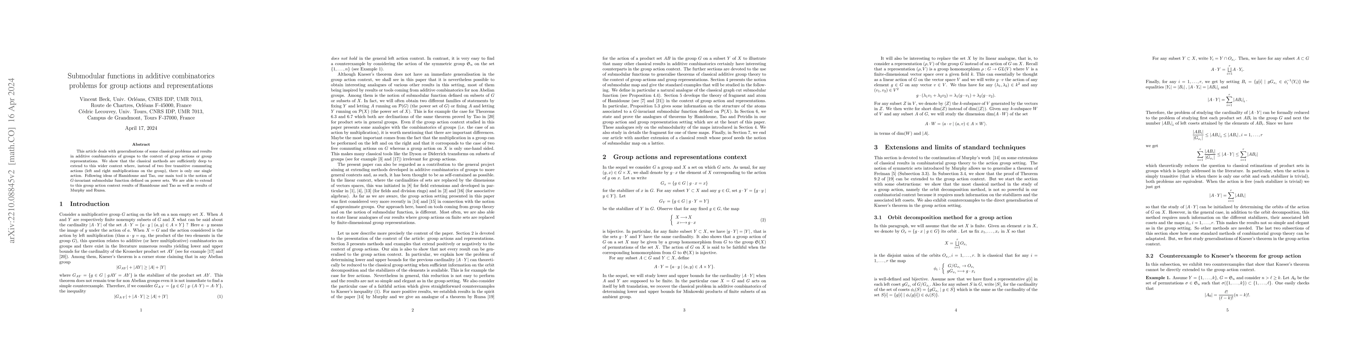 Summary: This paper explores analogues of classical additive combinatorics problems within the framework of group actions and representations, emphasizing the significance of left-invariant submodular functions on power sets in its proofs. The study is a restructured version of previous work.