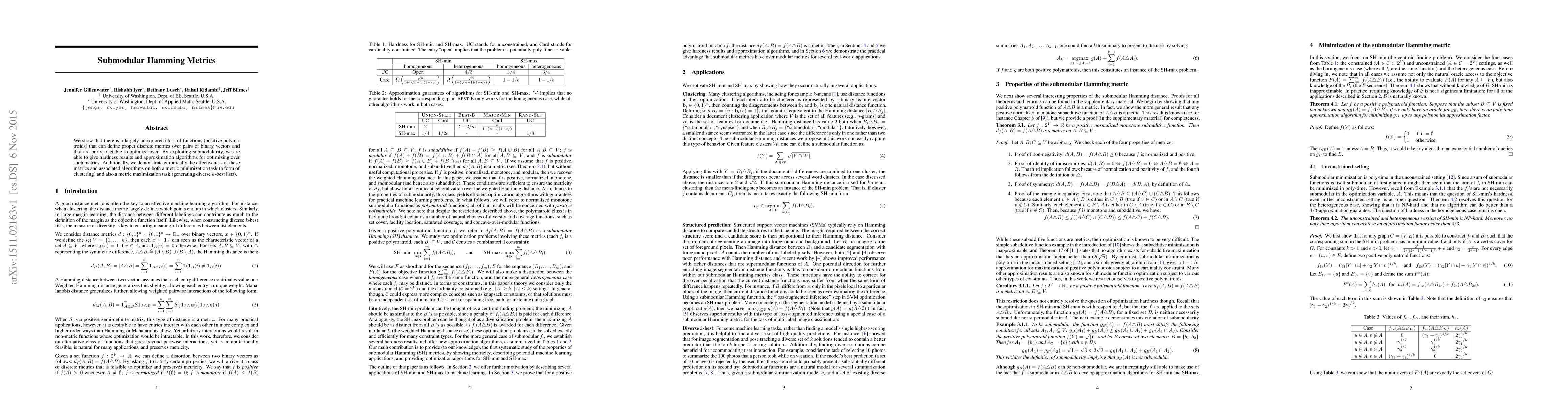 We show that there is a largely unexplored class of functions (positive polymatroids) that can define proper discrete metrics over pairs of binary vectors and that are fairly tractable to optimize over. By exploiting submodularity, we are able to give hardness results and approximation algorithms for optimizing over such metrics. Additionally, we demonstrate empirically the effectiveness of these metrics and associated algorithms on both a metric minimization task (a form of clustering) and also a metric maximization task (generating diverse k-best lists).