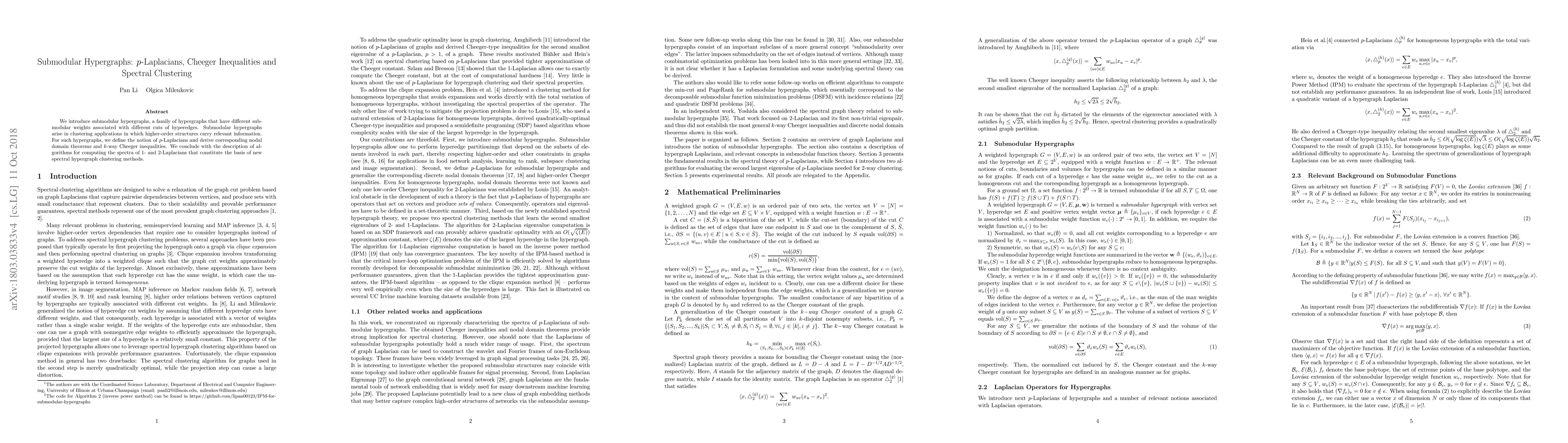 This paper introduces submodular hypergraphs, emphasizing their role in clustering applications involving higher-order structures. It defines p-Laplacians and derives relevant theorems and Cheeger inequalities, concluding with algorithms for spectral clustering using 1- and 2-Laplacians.