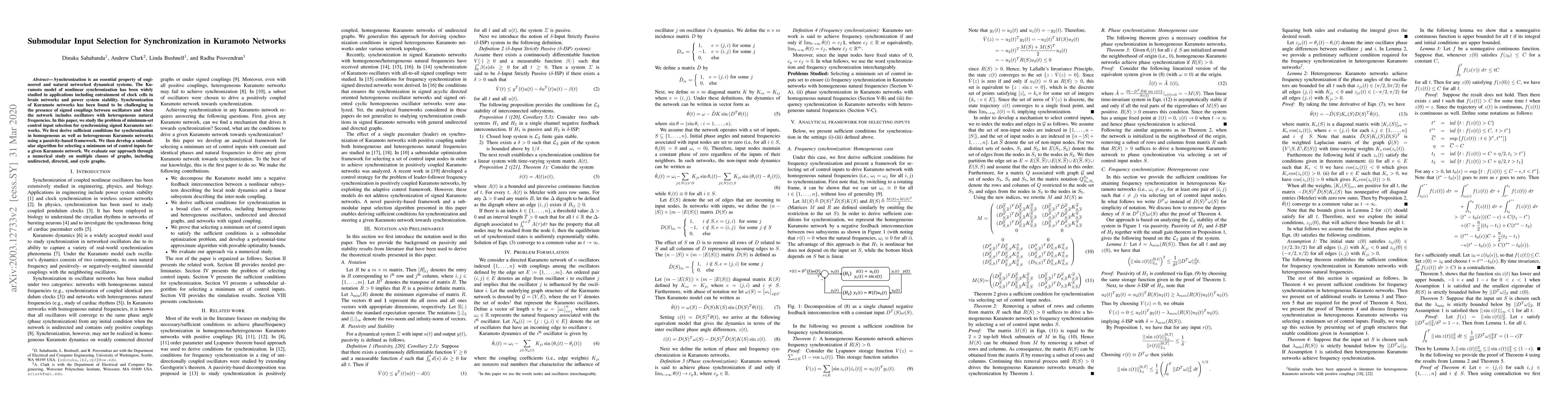 This paper proposes a submodular algorithm for selecting minimum control inputs to synchronize Kuramoto networks, addressing challenges in signed couplings and heterogeneous natural frequencies. The study derives synchronization conditions and evaluates the approach through numerical simulations on various graph types.