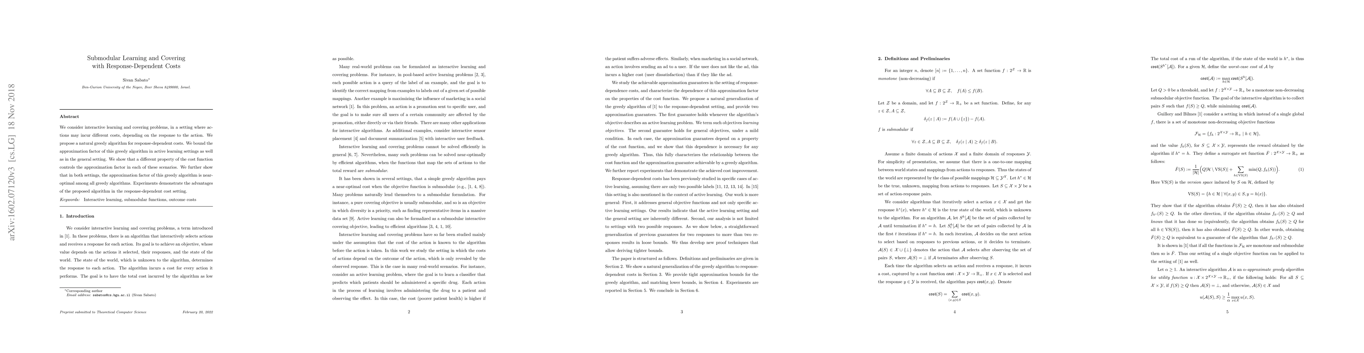 The paper proposes a greedy algorithm for interactive learning and covering problems with response-dependent costs, analyzing its approximation factor in active learning and general settings. It demonstrates near-optimality among greedy algorithms for both scenarios.