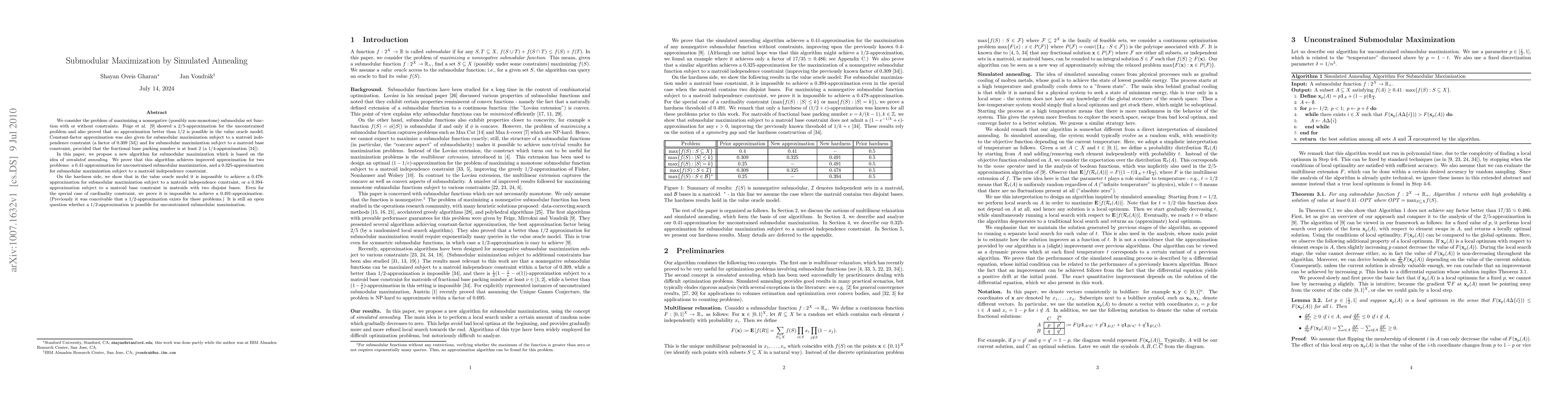 This paper introduces a simulated annealing algorithm for submodular maximization, achieving improved approximations: 0.41 for unconstrained problems and 0.325 for those with matroid independence constraints. It also proves lower bounds, showing it's impossible to surpass certain approximation ratios for constrained submodular maximization.