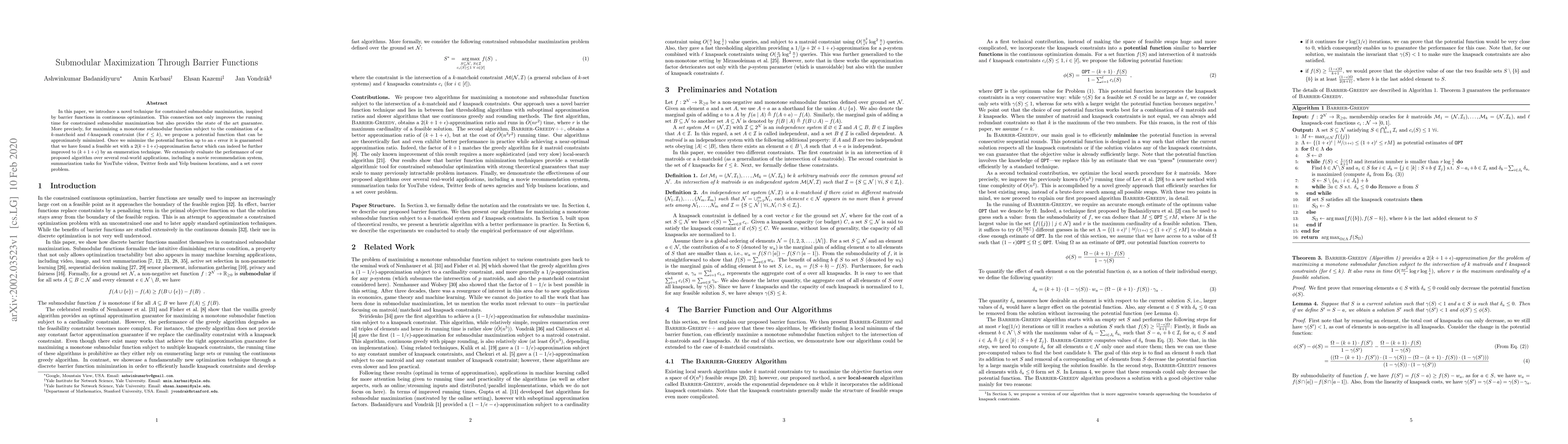 This paper presents a new method for constrained submodular maximization using barrier functions to improve running time and provide state-of-the-art guarantees. The proposed potential function offers a $(k+1+\epsilon)$-approximation for a combination of $k$-matchoid and $\ell$-knapsack constraints, validated through real-world applications.