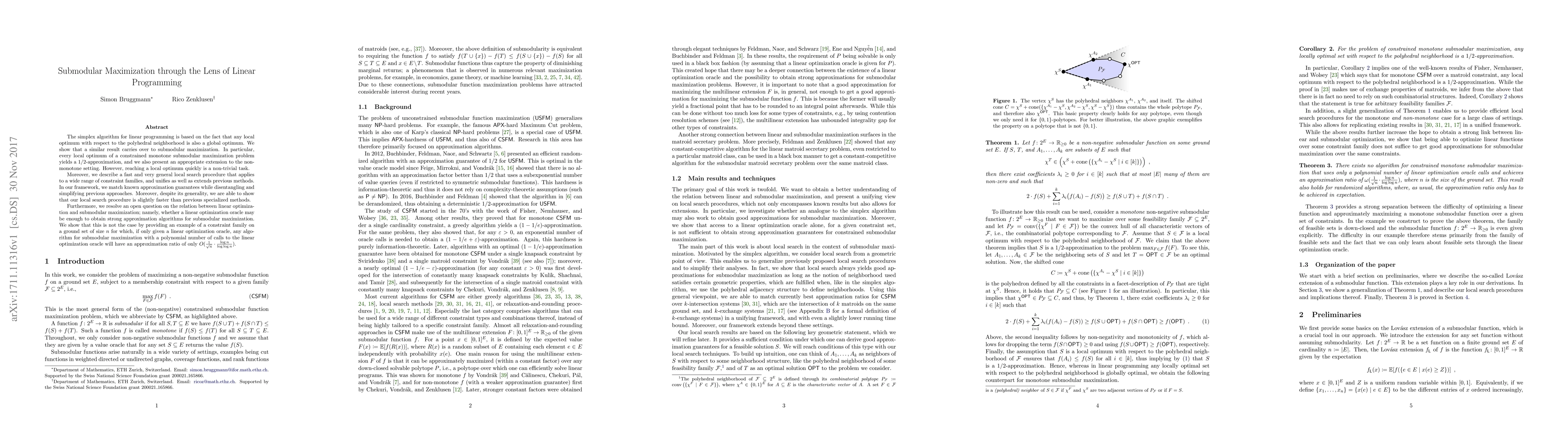 The simplex algorithm for linear programming is based on the fact that any local optimum with respect to the polyhedral neighborhood is also a global optimum. We show that a similar result carries over to submodular maximization. In particular, every local optimum of a constrained monotone submodular maximization problem yields a $1/2$-approximation, and we also present an appropriate extension to the non-monotone setting. However, reaching a local optimum quickly is a non-trivial task. Moreover, we describe a fast and very general local search procedure that applies to a wide range of constraint families, and unifies as well as extends previous methods. In our framework, we match known approximation guarantees while disentangling and simplifying previous approaches. Moreover, despite its generality, we are able to show that our local search procedure is slightly faster than previous specialized methods. Furthermore, we resolve an open question on the relation between linear optimization and submodular maximization; namely, whether a linear optimization oracle may be enough to obtain strong approximation algorithms for submodular maximization. We show that this is not the case by providing an example of a constraint family on a ground set of size $n$ for which, if only given a linear optimization oracle, any algorithm for submodular maximization with a polynomial number of calls to the linear optimization oracle will have an approximation ratio of only $O ( \frac{1}{\sqrt{n}} \cdot \frac{\log n}{\log\log n} )$.
