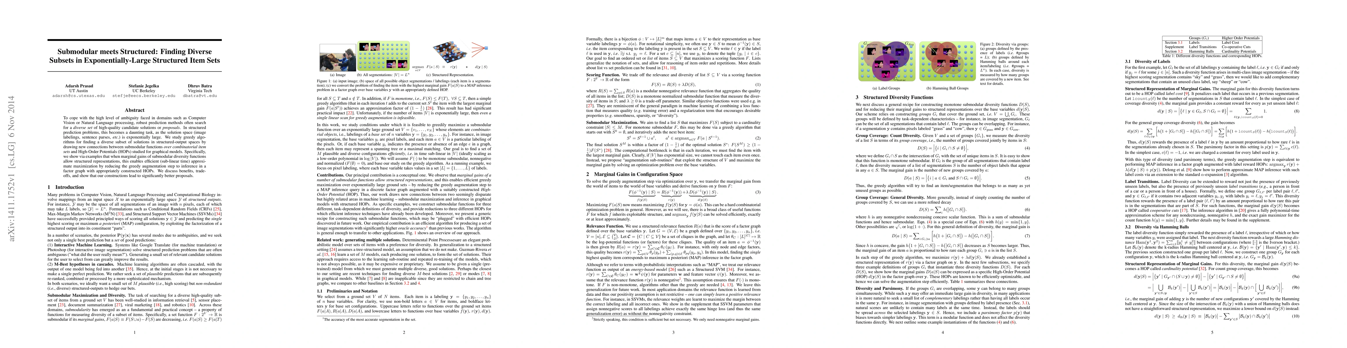To cope with the high level of ambiguity faced in domains such as Computer Vision or Natural Language processing, robust prediction methods often search for a diverse set of high-quality candidate solutions or proposals. In structured prediction problems, this becomes a daunting task, as the solution space (image labelings, sentence parses, etc.) is exponentially large. We study greedy algorithms for finding a diverse subset of solutions in structured-output spaces by drawing new connections between submodular functions over combinatorial item sets and High-Order Potentials (HOPs) studied for graphical models. Specifically, we show via examples that when marginal gains of submodular diversity functions allow structured representations, this enables efficient (sub-linear time) approximate maximization by reducing the greedy augmentation step to inference in a factor graph with appropriately constructed HOPs. We discuss benefits, tradeoffs, and show that our constructions lead to significantly better proposals.
