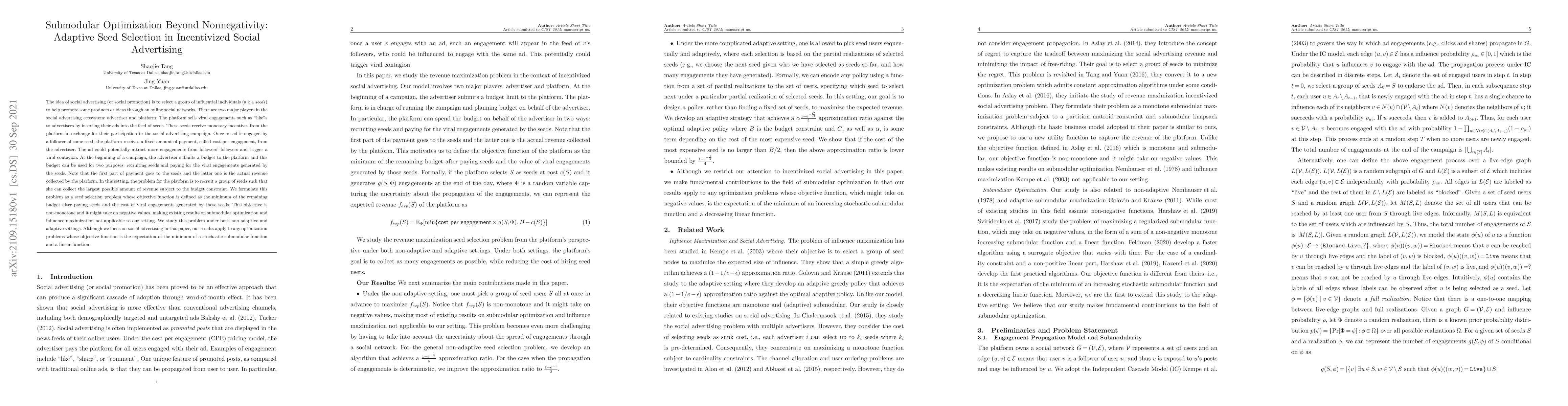 This paper addresses the challenge of selecting influential seeds in incentivized social advertising, where the objective function can be non-monotone and negative. The authors propose a novel approach to maximize platform revenue within a budget constraint, applicable to both non-adaptive and adaptive settings, and extend their findings to broader optimization problems involving stochastic submodular functions.