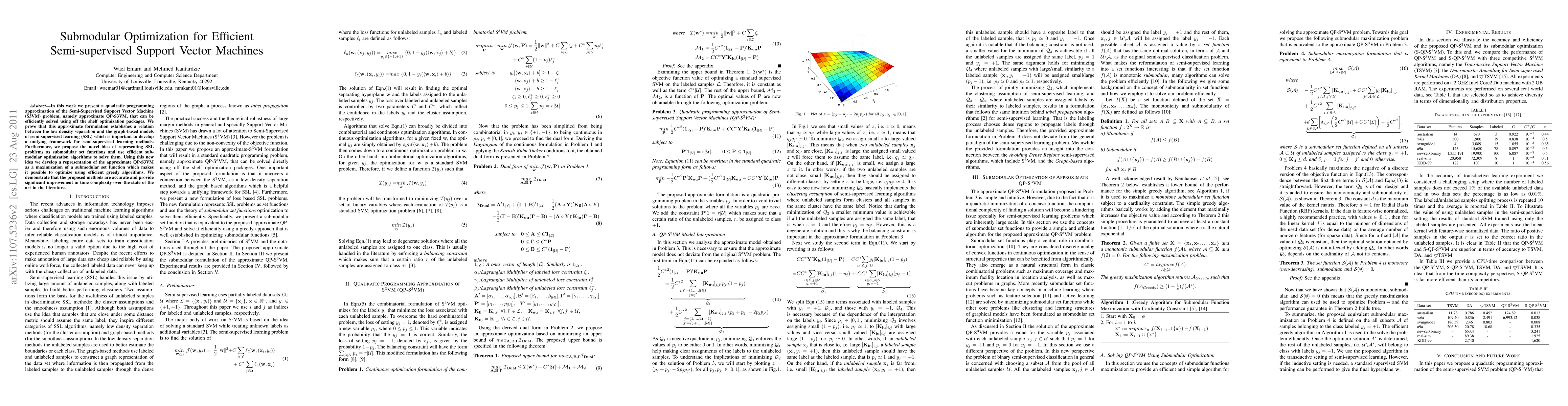 The paper presents a quadratic programming approximation (QP-S3VM) of the S3VM problem and a submodular optimization approach (S-QP-S3VM) for efficient and accurate semi-supervised learning.