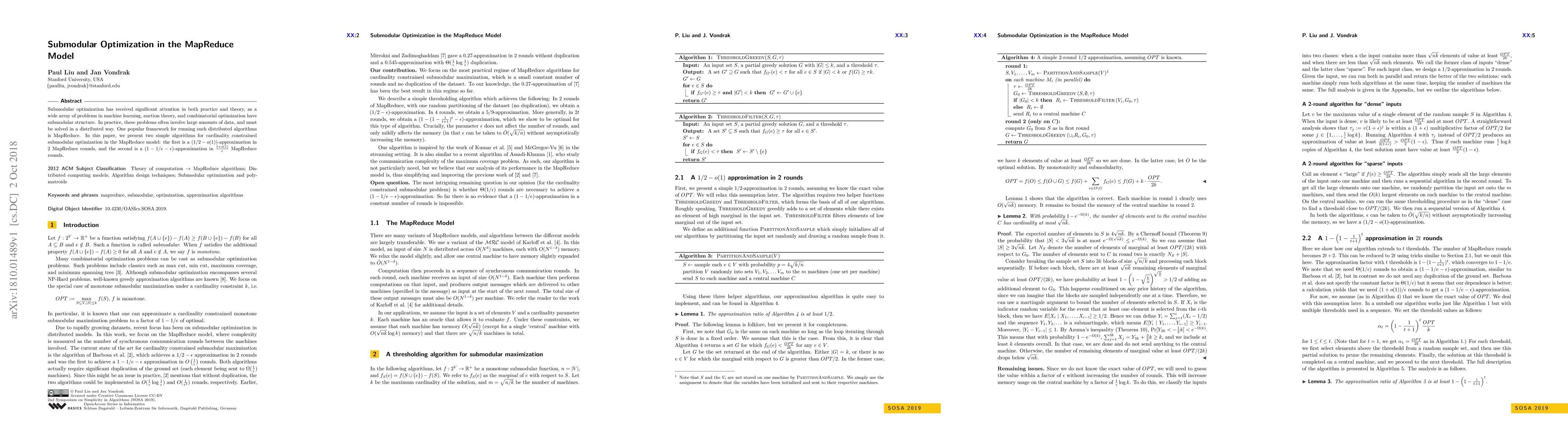 This paper proposes two algorithms for cardinality constrained submodular optimization in the MapReduce framework: one achieving a $(1/2-o(1))$-approximation in 2 rounds and the other a $(1-1/e-\epsilon)$-approximation in $\frac{1+o(1)}{\epsilon}$ rounds, addressing large-scale problems in distributed computing.