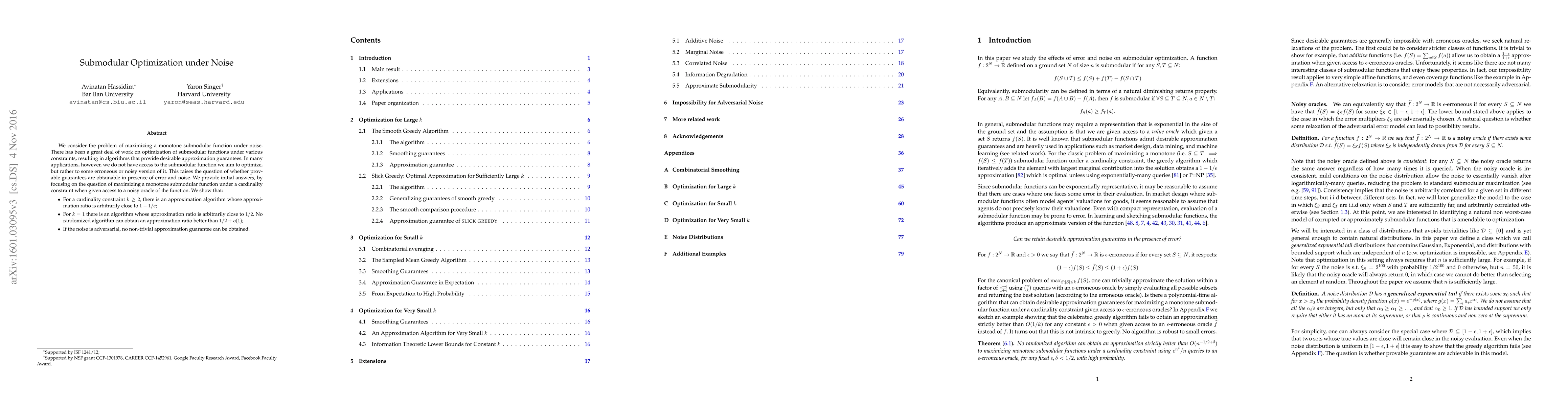 We consider the problem of maximizing a monotone submodular function under noise. There has been a great deal of work on optimization of submodular functions under various constraints, resulting in algorithms that provide desirable approximation guarantees. In many applications, however, we do not have access to the submodular function we aim to optimize, but rather to some erroneous or noisy version of it. This raises the question of whether provable guarantees are obtainable in presence of error and noise. We provide initial answers, by focusing on the question of maximizing a monotone submodular function under a cardinality constraint when given access to a noisy oracle of the function. We show that: - For a cardinality constraint $k \geq 2$, there is an approximation algorithm whose approximation ratio is arbitrarily close to $1-1/e$; - For $k=1$ there is an algorithm whose approximation ratio is arbitrarily close to $1/2$. No randomized algorithm can obtain an approximation ratio better than $1/2+o(1)$; -If the noise is adversarial, no non-trivial approximation guarantee can be obtained.