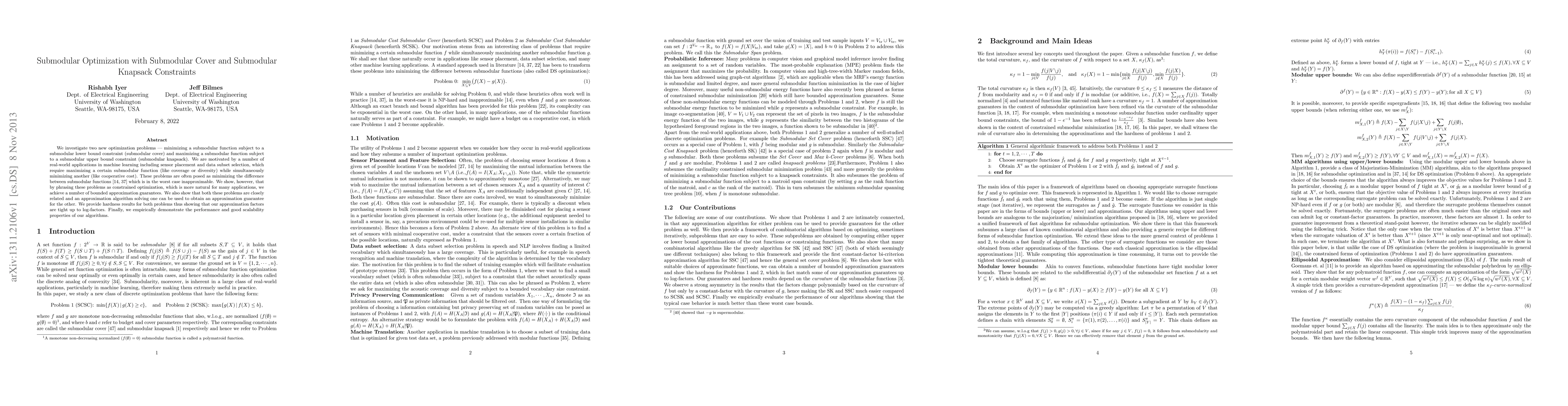 This paper studies two constrained submodular optimization problems: minimizing a submodular function under a submodular cover constraint and maximizing a submodular function under a submodular knapsack constraint. It provides bounded approximation guarantees and demonstrates the scalability and performance of the proposed algorithms through empirical evaluation.