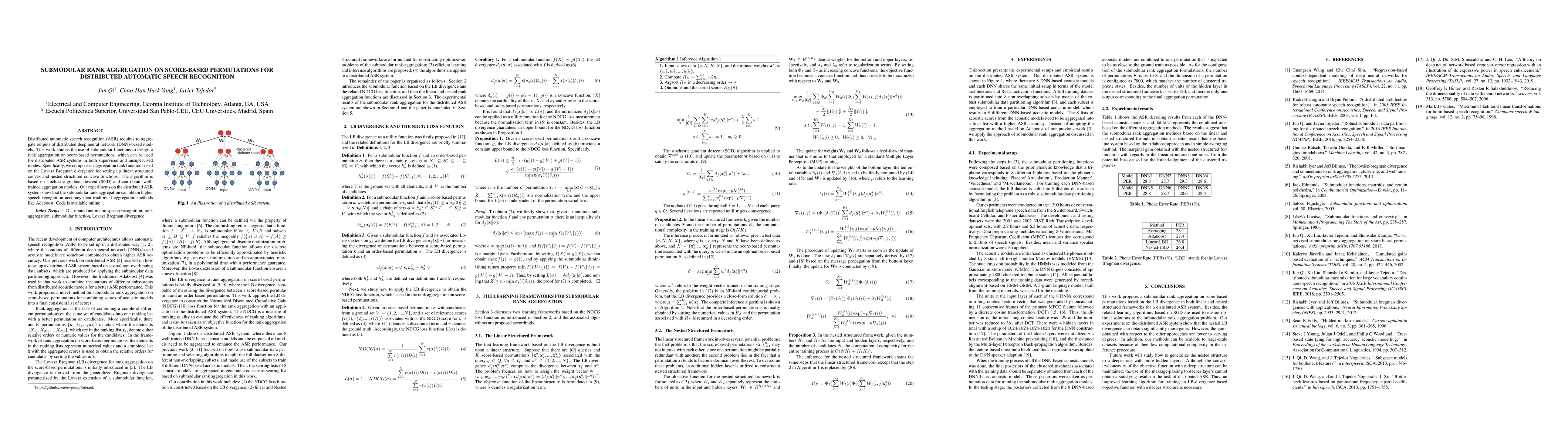 Distributed automatic speech recognition (ASR) requires to aggregate outputs of distributed deep neural network (DNN)-based models. This work studies the use of submodular functions to design a rank aggregation on score-based permutations, which can be used for distributed ASR systems in both supervised and unsupervised modes. Specifically, we compose an aggregation rank function based on the Lovasz Bregman divergence for setting up linear structured convex and nested structured concave functions. The algorithm is based on stochastic gradient descent (SGD) and can obtain well-trained aggregation models. Our experiments on the distributed ASR system show that the submodular rank aggregation can obtain higher speech recognition accuracy than traditional aggregation methods like Adaboost. Code is available online~\footnote{https://github.com/uwjunqi/Subrank}.